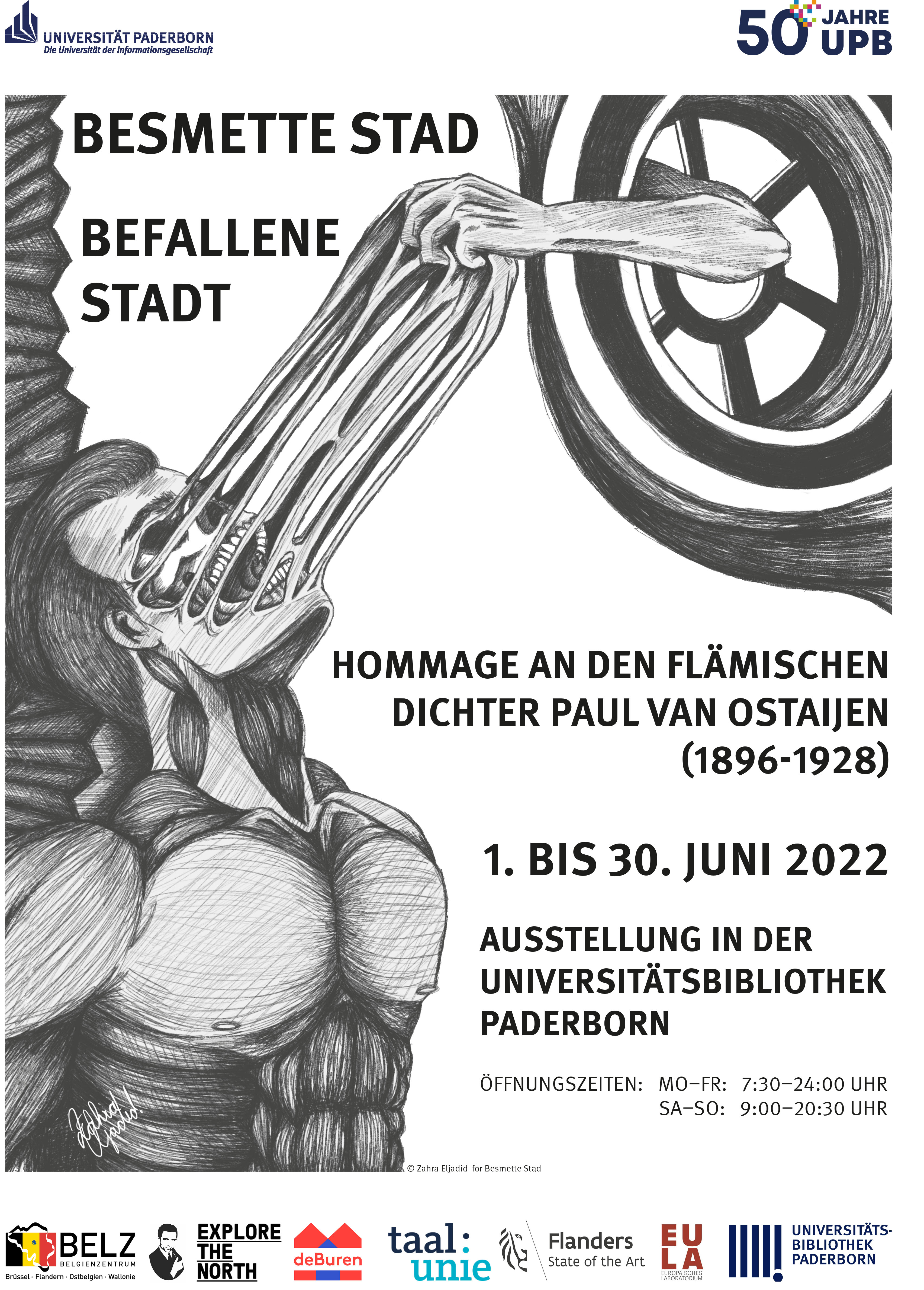 Vom 1. bis 30. Juni ist die Wanderausstellung „Besmette stad / Befallene Stadt. Hommage an den flämischen Dichter Paul van Ostaijen (1896-1928)“ in Paderborn zu sehen. Sie zeigt eine Auswahl an Arbeiten von 150 zeitgenössischen flämischen, niederländischen und deutschsprachigen Künstler*innen, die sich mit dem Gedichtband „Bezette Stad“ (Besetzte Stadt) von Paul van Ostaijen auseinandergesetzt haben. Interessierte können die Ausstellung, in der es um herausfordernde Visionen einer Welt in der Krise geht, im Foyer der Universitätsbibliothek Paderborn, Warburger Straße 100, besuchen. Die Universitätsbibliothek ist montags bis freitags von 7:30 bis 24 Uhr sowie samstags und sonntags von 9 bis 20:30 Uhr geöffnet, an gesetzlichen Feiertagen ist sie geschlossen. Die Vernissage findet am Donnerstag, 2. Juni, mit der Illustratorin und Malerin Zahra Eljadid, dem flämischen Schauspieler und Regisseur Tom Van Bauwel, Paul Van Ostaijen-Biograf Matthijs de Ridder und Kuratorin Anna Eble statt. Interessierte sind herzlich zu der Veranstaltung um 11:30 Uhr eingeladen. Das Belgienzentrum (BELZ) der Universität Paderborn hat die Wanderausstellung dank der großen Unterstützung der Generaldelegation Flanderns und der Taalunie nach Paderborn holen können. Zum Start der Ausstellung am 1. Juni findet gleichzeitig der sechste Belgientag des BELZ statt.