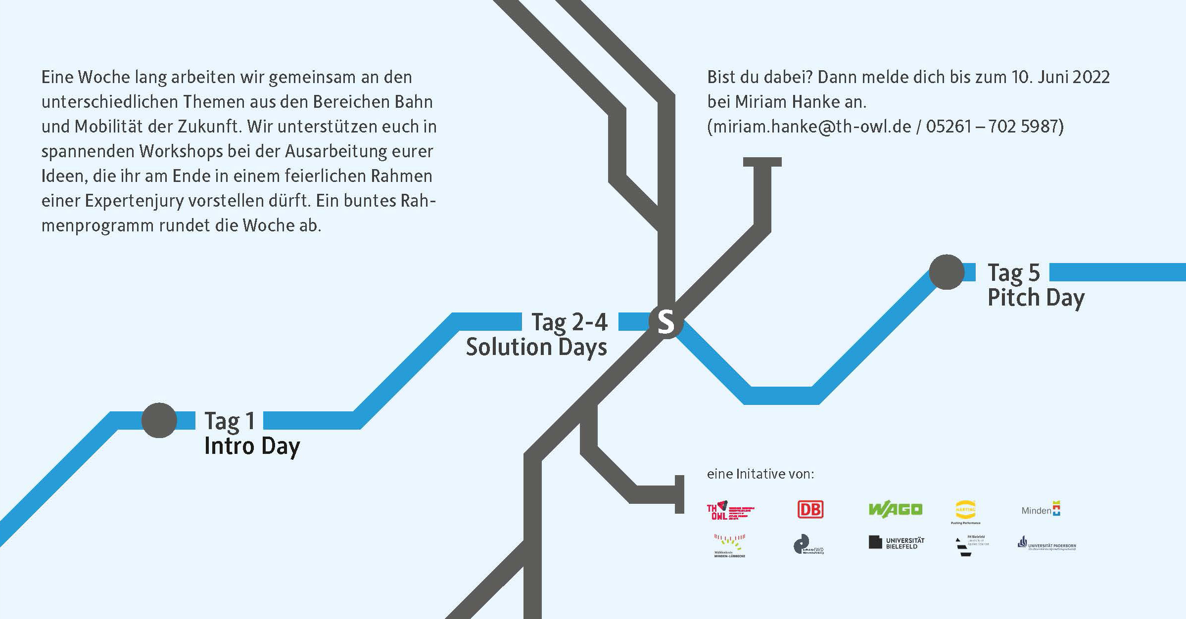 Mit dem RailCampus OWL entsteht in Minden ein einzigartiges Innovationsökosystem zur schienengebundenen Mobilität der Zukunft. Um ihn bereits vor der Fertigstellung der entsprechenden Infrastruktur mit Leben zu füllen, veranstaltet das Institut für Wissenschaftsdialog in Kooperation mit allen beteiligten Partnerinstitutionen von Montag, 20. Juni, bis Freitag, 24. Juni, die erste RailWeek OWL auf dem Betriebsgelände der DB-Systemtechnik GmbH in Minden. Studierende der Universität Paderborn können sich bis Freitag, 10. Juni, zur kostenlosen Teilnahme inklusive Verpflegung und Unterkunft bei Miriam Hanke (miriam.hanke@th-owl.de) anmelden.