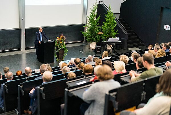 After the opening speeches, a panel discussion, moderated by Julia Ures, was held with student teachers from the university, who gave first-hand insights into students’ experiences of working with the PLAZ. “The PLAZ is the central contact point for everything relating to our studies. There’s always someone on hand to lend a sympathetic ear and provide you with the right support,” said student teachers Kira Brinkwirth and Carolin Honermann of the centre, and thanking it for its support. A short film produced especially for the anniversary event gave an overview of the special profile of teacher training at Paderborn University. Following these anniversary congratulations, Emeritus Professor Eckard König inspired the 250 attendees with his keynote speech, in which he discussed the importance of guidance in teacher training.