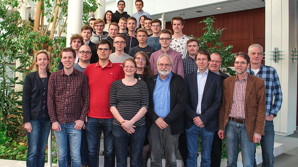 Foto (Universität Paderborn): Die Schülerinnen und Schüler, Lehrerinnen und Lehrer, Schulleitung, wissenschaftliche Mitarbeiterinnen und Mitarbeiter, Professoren und Kooperationspartner im Heinz Nixdorf Institut der Universität Paderborn.