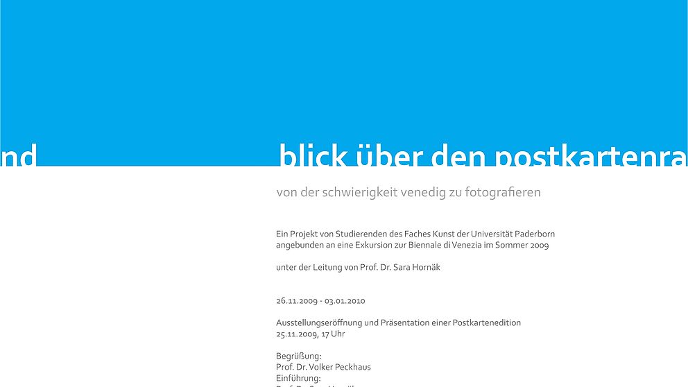 „blick über den postkartenrand – von der schwierigkeit venedig zu fotografieren“ ist ein Projekt von Studierenden des Faches Kunst der Universität Paderborn, angebunden an eine Exkursion zur Biennale di Venezia im Sommer 2009 unter der Leitung von Prof. Dr. Sara Hornäk. Ausstellungseröffnung und Präsentation einer Postkartenedition in der Universitätsbibliothek Paderborn am 25.11.2009 um 17 Uhr.