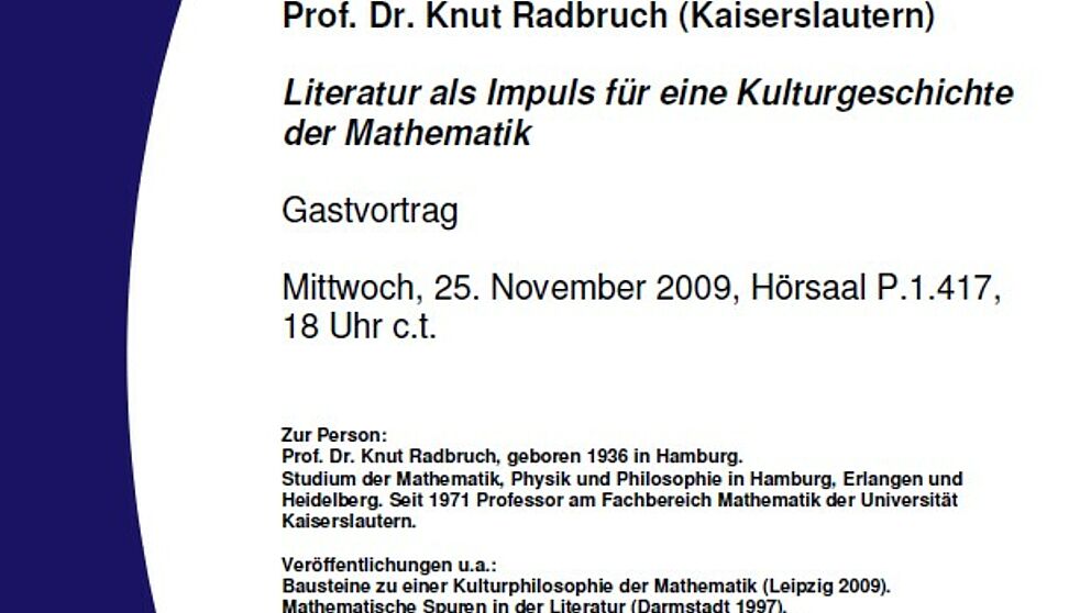 Am Mittwoch, 25. November 2009, hält Prof. Dr. Knut Radbruch einen Gastvortrag zum Thema "Literatur als Impuls für eine Kulturgeschichte der Mathematik". Der Vortrag wird im Hörsaal P1.417 um 18 Uhr c. t. stattfinden. Hierzu laden die Projektgruppe "Dialogizität des Wissens", das Mathematische Kolloquium und das Kolloquium zur Philosophie alle Interessenten herzlich ein.