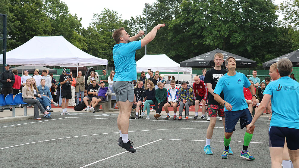 Photo (Paderborn University, Heiko Appelbaum): Prof Dr Matthias Bauer, President of Paderborn University, at the "3x3" basketball game at the opening of the "Campus Champions" tournament.