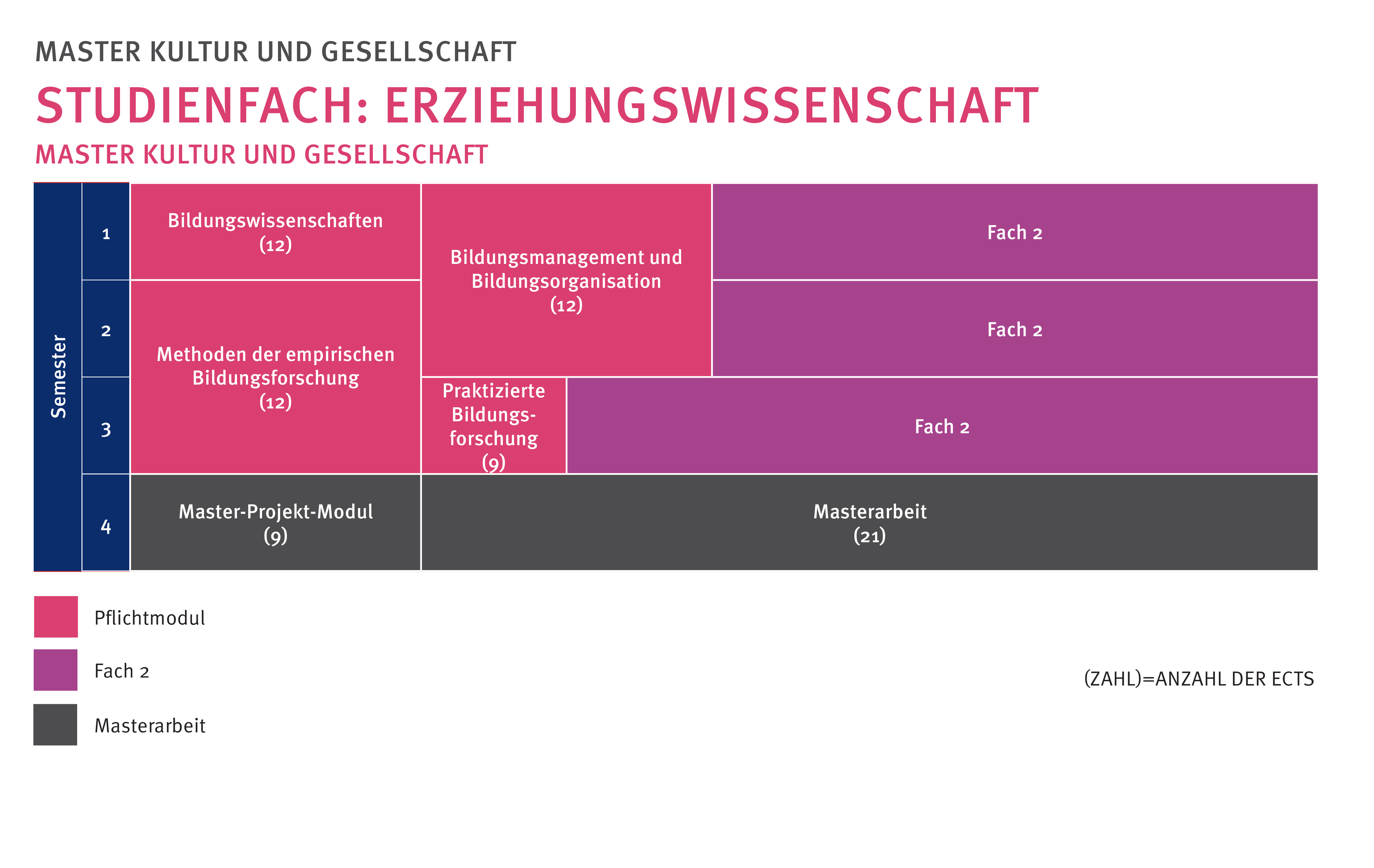 Das Masterstudienfach Erziehungswissenschaft ist forschungsorientiert und vermittelt dir Kompetenzen zu eigenständiger erziehungswissenschaftlicher Forschung im Bereich der außerschulischen Bildungsarbeit. Du vertiefst methodische Kenntnisse der empirischen Bildungsforschung und wendest diese in einem Forschungsprojekt an.