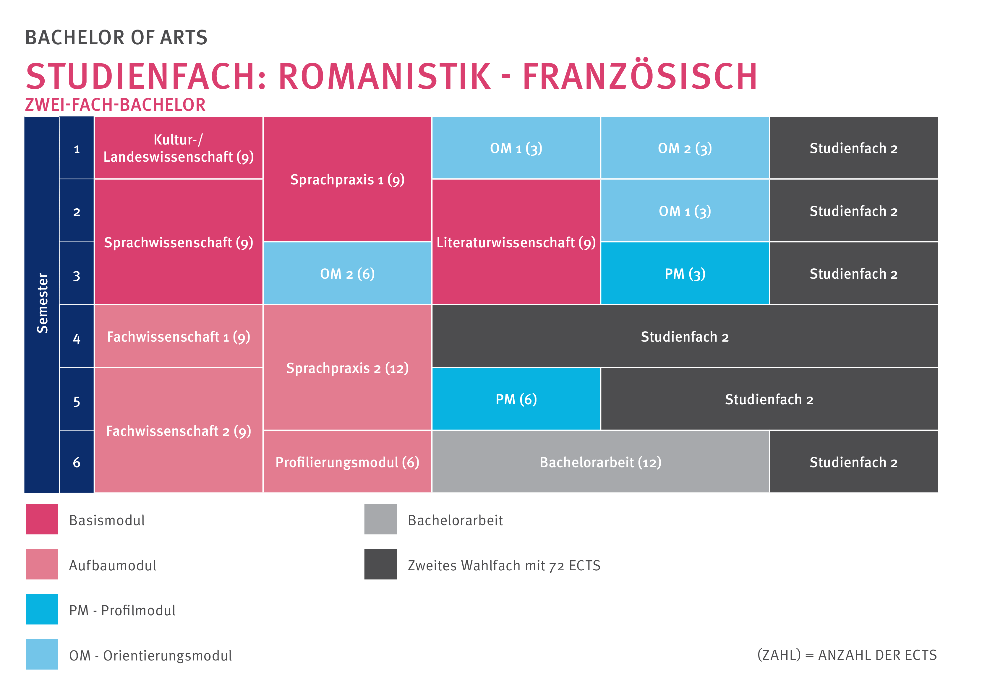 Im Rahmen des Zwei-Fach-Bachelors werden zwei Fächer gleichwertig studiert. Du musst also das Fach Romanistik/ Französisch mit einem weiteren Fach kombinieren. Auf der Webseite des Zwei-Fach-Bachelors Kulturwissenschaften findest du allgemeine Informationen zum Studiengang, zur Fächerübersicht und zu den Kombinationsmöglichkeiten.