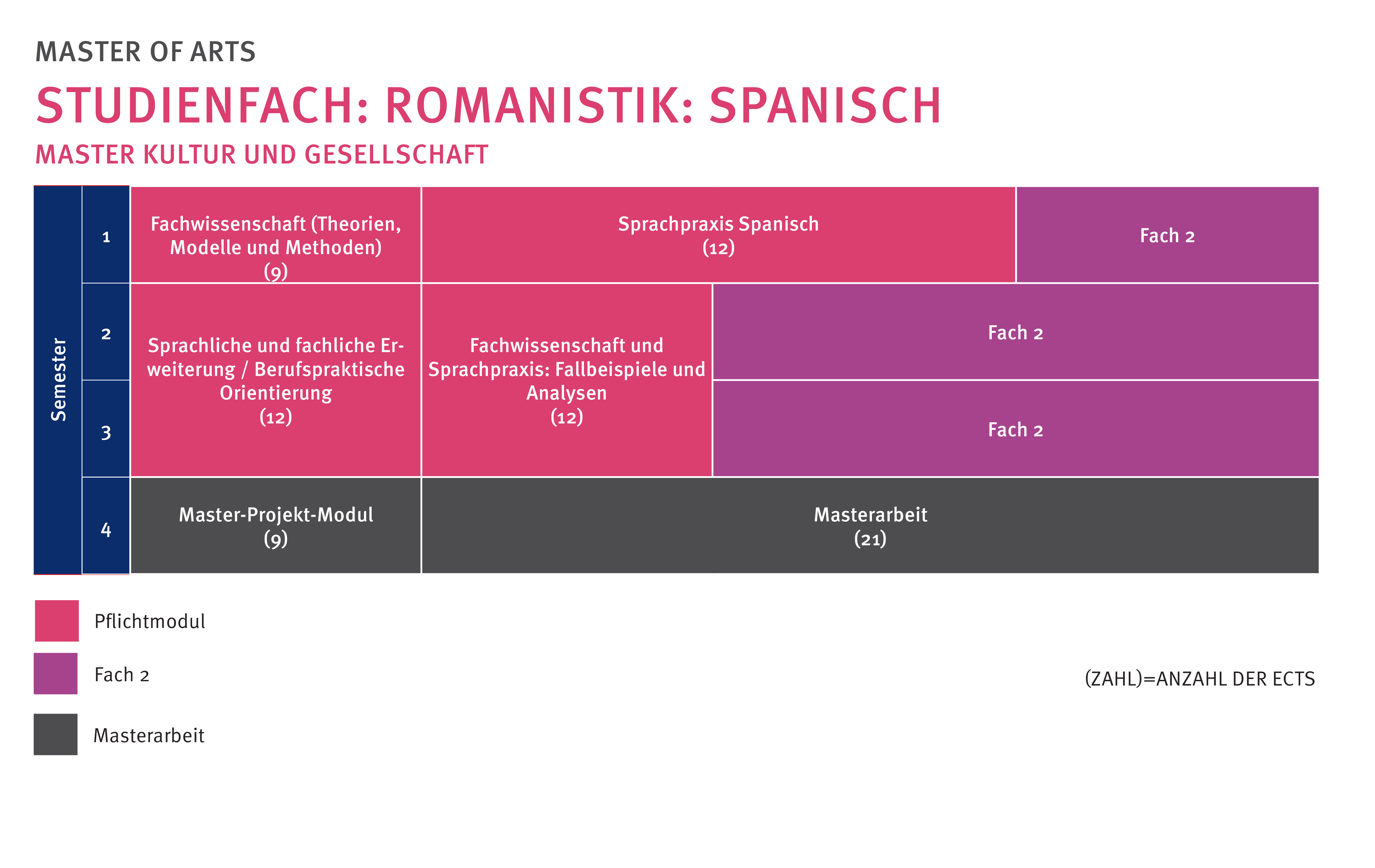 Das Studienfach Romanistik/Spanisch ist forschungsorientiert angelegt, sodass du einerseits die Voraussetzung für eine mögliche spätere Promotion schaffst, andererseits aber auch wichtige Qualifikationen für Berufsfelder außerhalb der Wissenschaft erlangst. Du vertiefst und erweiters dein im Bachelorstudium erworbenes Wissen sowie deine sprachlichen und methodischen Kompetenzen. So können wir dich an den aktuellen Forschungsstand heranführen.