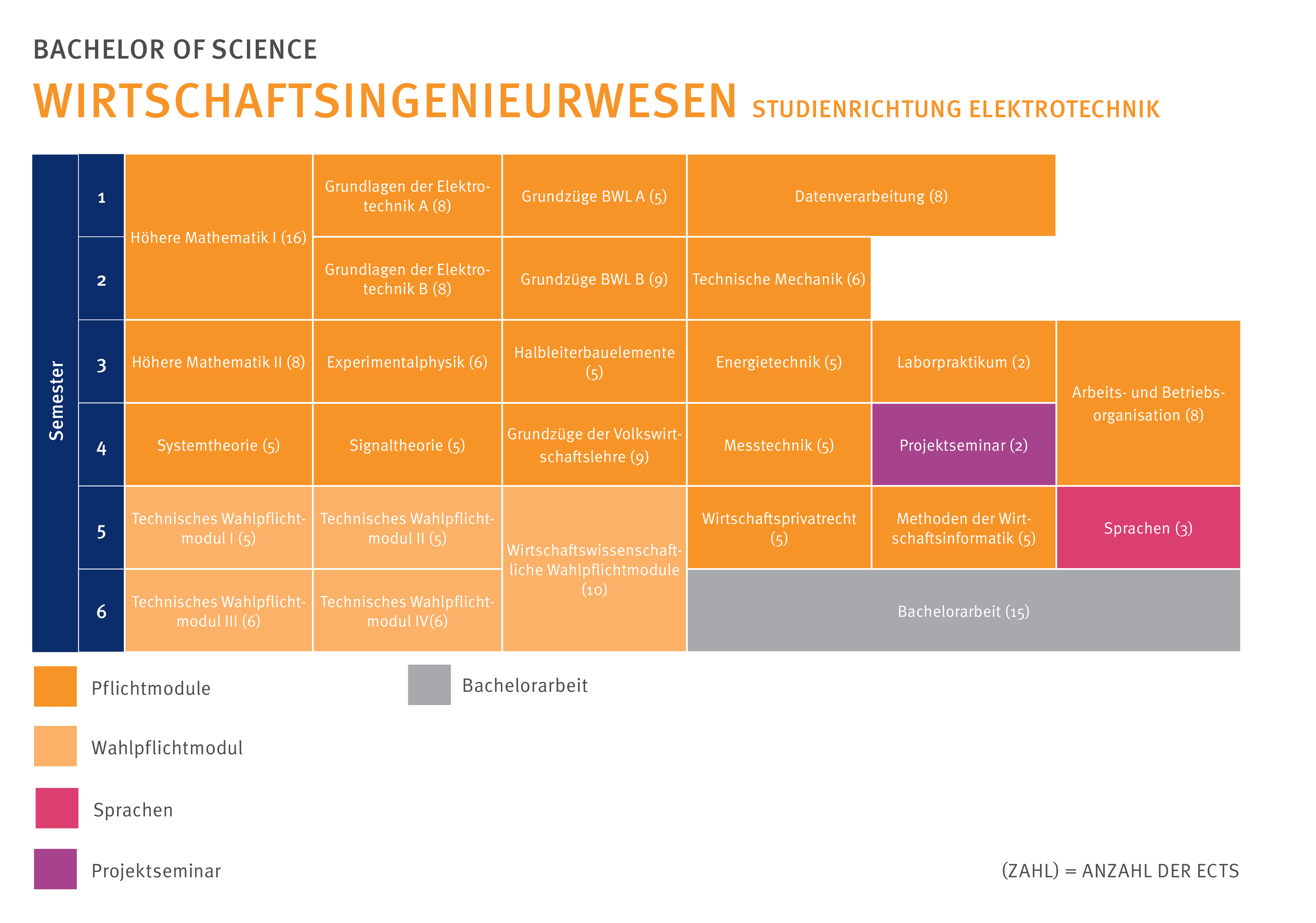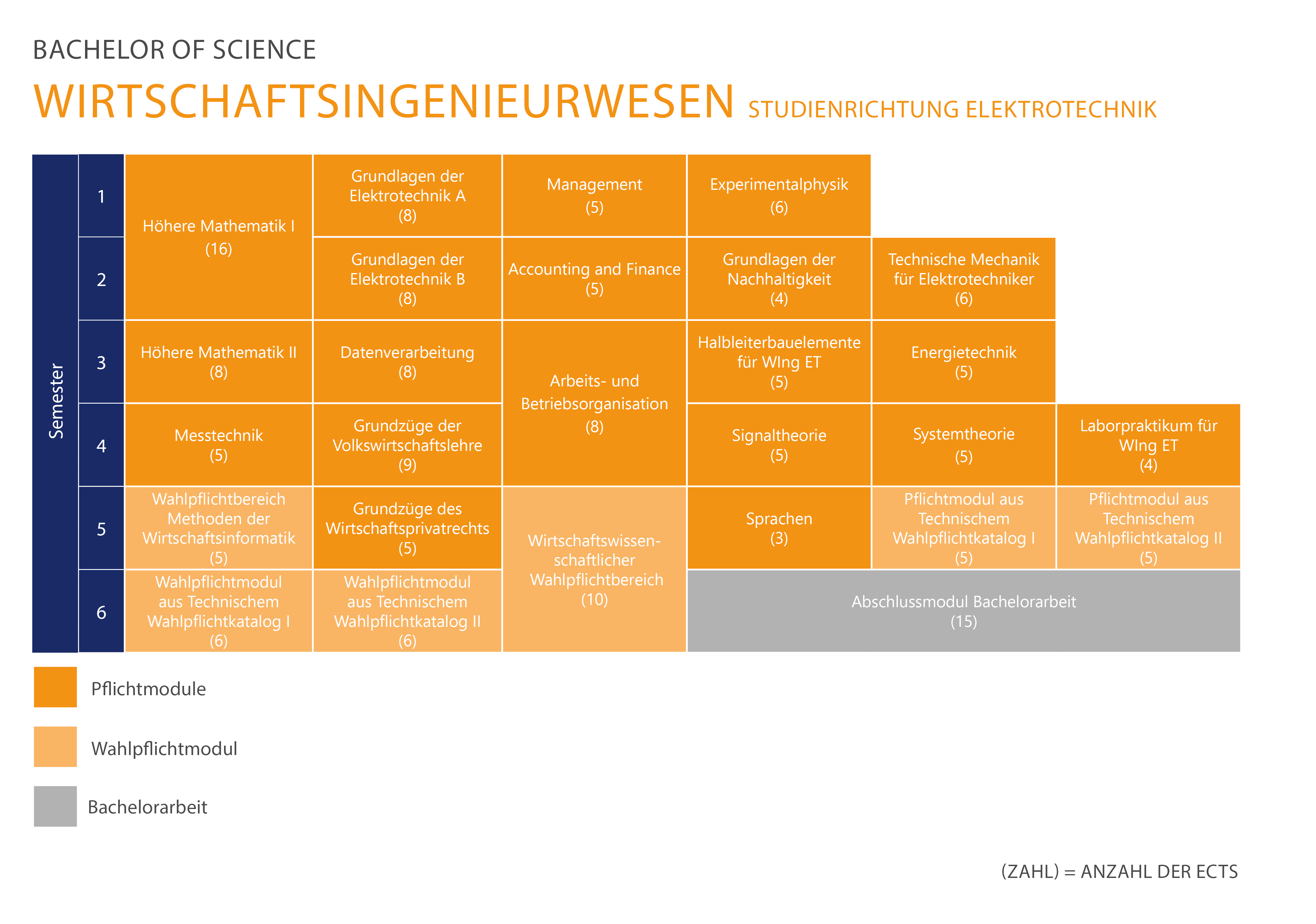 Der Bachelorstudiengang Wirtschaftsingenieurwesen umfasst eine Regelstudienzeit von sechs Semestern und gliedert sich in zwei aufeinander folgende Studienabschnitte: das Grundstudium (1.-4. Semester) und das Vertiefungsstudium (5.-6. Semester).