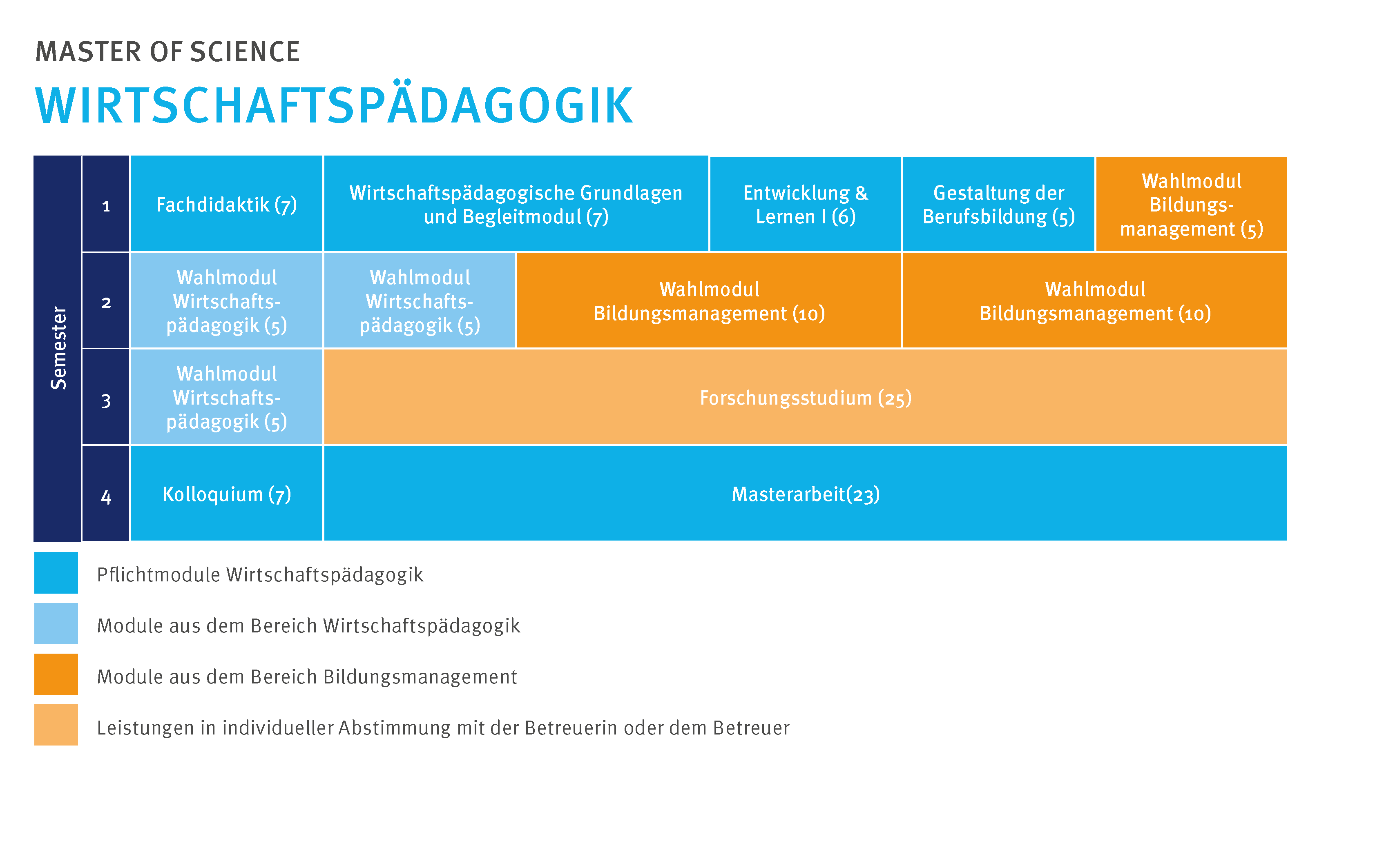 Insgesamt sind Wahlmodule aus dem Bereich Wirtschafspädagogik im Umfang von 15 ECTS einzubringen.