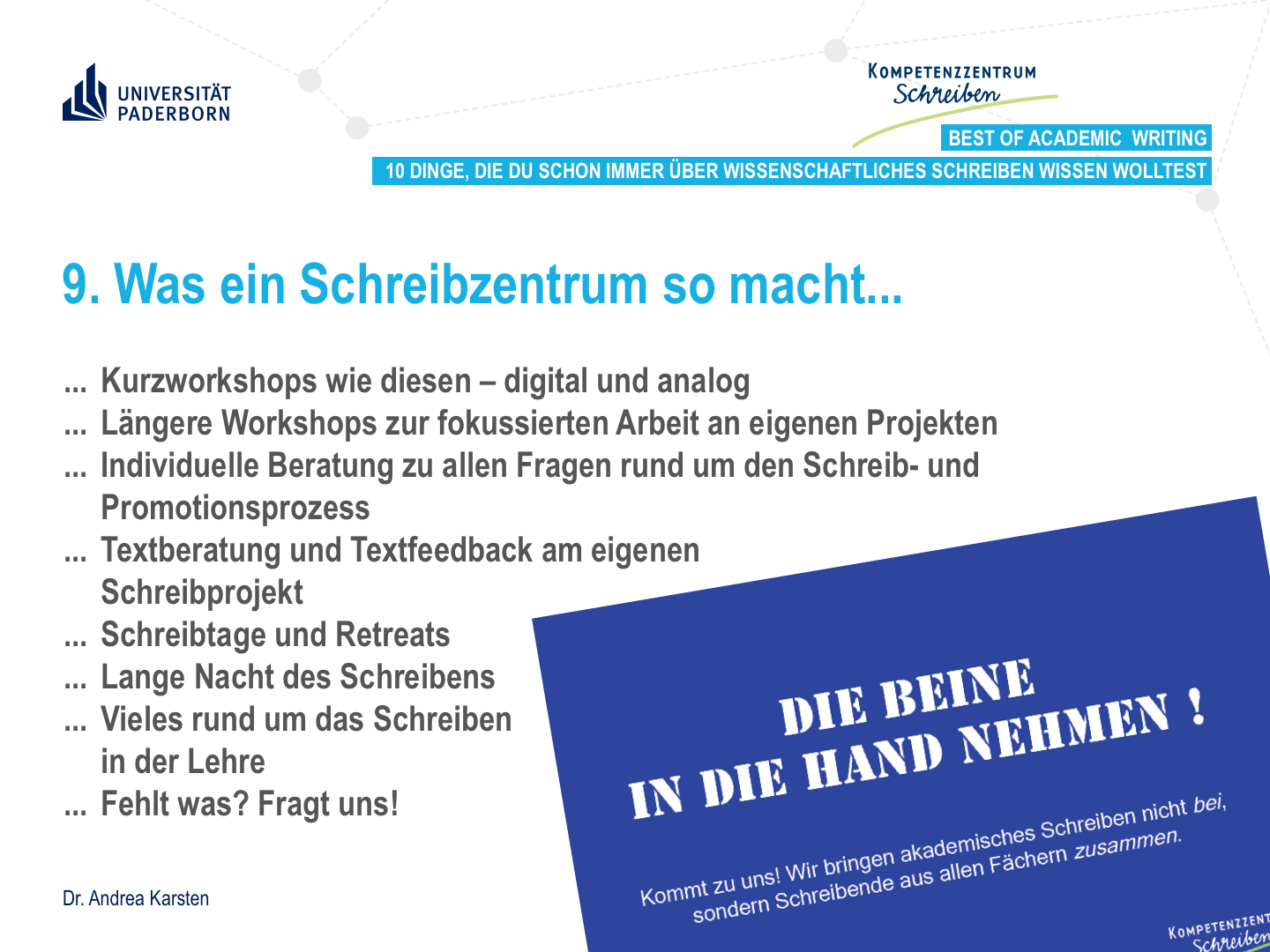 Dies ist ein kleiner Online-Workshop zum Selbstbearbeiten. Der Workshop richtet sich an alle, die schon (etwas) Erfahrung mit akademischem Schreiben haben. Ihr findet hier zehn unserer besten Infos und Übungen zum akademischen Schreiben aus Kursen für fortgeschrittene Studierende, Promovierende und Lehrende.