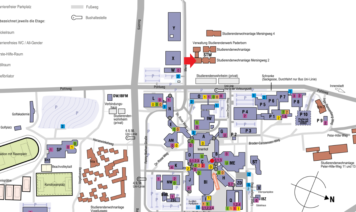 Bei mehrstelligen Zahlen hinter dem Buchstaben gibt die erste Zahl das Stockwerk an und die Zahlen hinter dem Punkt die Raumnummer (z. B. W1.101 = Gebäude W, 1. Etage, Raum 101).