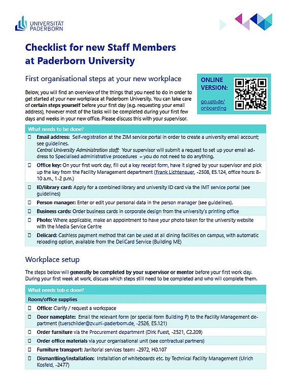 Paderborn University would like to support you as a new employee during your induction and familiarisation. Download our checklist for new employees on this page. We also provide a checklist for supervisors who hire new employees. These are available in German and English.