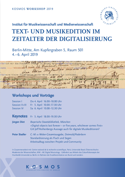 Peter Stadler wird an der Humboldt-Universität zu Berlin im Rahmen des dort stattfindenden KOSMOS-Workshop eine Keynote mit dem Titel „Standardisierung als Fluch und Segen - Arbeitsalltag zwischen Projekt und Community“ geben. Der dreitägige Workshop befasst sich in diesem Jahr mit dem Thema „Text- und Musikedition im Zeitalter der Digitalisierung“ (Mehr Informationen zum KOSMOS-Workshop finden Sie hier).