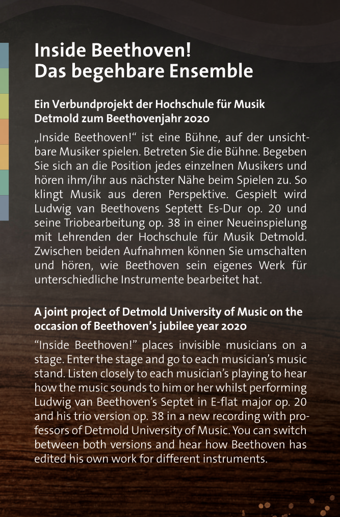 Das Projekt präsentiert auf einem Bühnenraum ein virtuelles Ensemble, dessen Klang vom Besucher jeweils an der Position der einzelnen Musiker wahrgenommen werden kann. Gespielt werden zwei Kammermusikwerke, die gegenwärtig im Modul 2 des Projekts "Beethovens Werkstatt" im Rahmen einer Vergleichs-App bearbeitet werden: Beethovens Septett op. 20 und seine Version für Klaviertrio (mit Klarinette und Violoncello). Dabei ist in der Ausstellung neben dem Mitverfolgen der Noten auch ein stufenloses Wechseln zwischen beiden Bearbeitungen möglich, so dass damit Beethovens Bearbeitungstechniken eindrucksvoll erfahrbar werden. Zu der Ausstellung ist im Beethoven-Haus Bonn eine 128-seitige Begleitpublikation mit den von Professor*innen der Hochschule für Musik Detmold neu eingespielten beiden Werken erschienen (herausgegeben von Axel Berndt und Joachim Veit), die während der Ausstellung und separat im Buchhandel erworben werden kann.