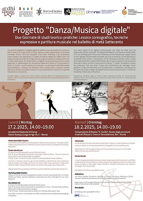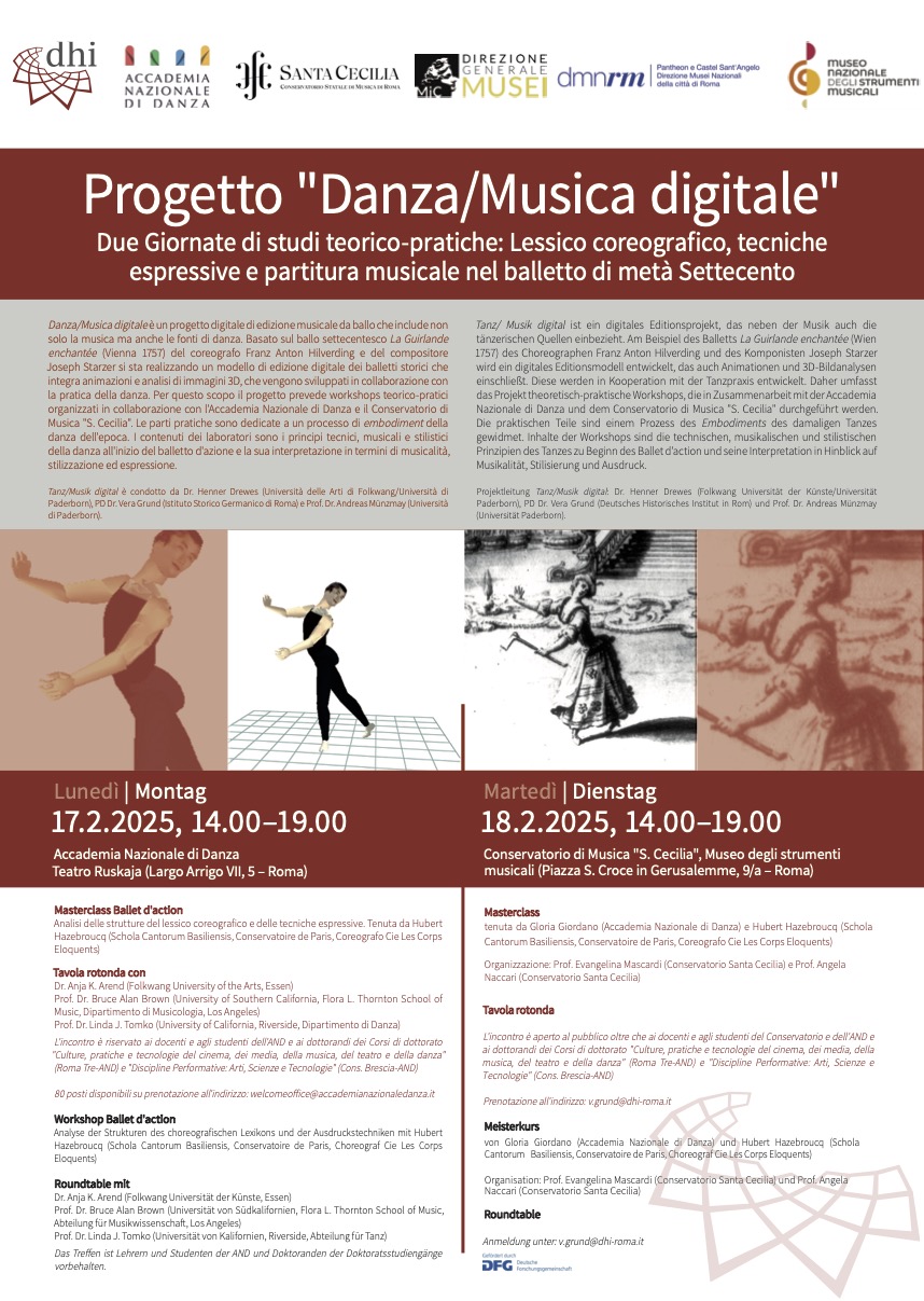 Tanz/ Musik digital ist ein digitales Editionsprojekt der Universität Paderborn, der Folkwang Hochschule Essen und des Deutschen Historischen Instituts in Rom, das neben der Musik auch die tänzerischen Quellen einbezieht. Am Beispiel des Balletts La Guirlande enchantée (Wien 1757) des Choreographen Franz Anton Hilverding und des Komponisten Joseph Starzer wird ein digitales Editionsmodell entwickelt, das auch Animationen und 3D-Bildanalysen einschließt. Diese werden in Kooperation mit der Tanzpraxis entwickelt. Daher umfasst das Projekt theoretisch-praktische Workshops, die in Zusammenarbeit mit der Accademia Nazionale di Danza und dem Conservatorio di Musica “S. Cecilia” durchgeführt werden. Die praktischen Teile sind einem Prozess des Embodiments des damaligen Tanzes gewidmet. Inhalte der Workshops sind die technischen, musikalischen und stilistischen Prinzipien des Tanzes zu Beginn des Ballet d'action und seine Interpretation in Hinblick auf Musikalität, Stilisierung und Ausdruck.