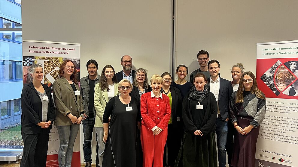 Foto (Ralf Brachtendorf): Die Projektbeteiligten freuen sich gemeinsam mit Vertreter*innen aus dem MKW NRW über den erfolgreichen Abschluss des Forschungsprojekts „L:IKE – Lernwerkstatt Immaterielles Kulturerbe“.