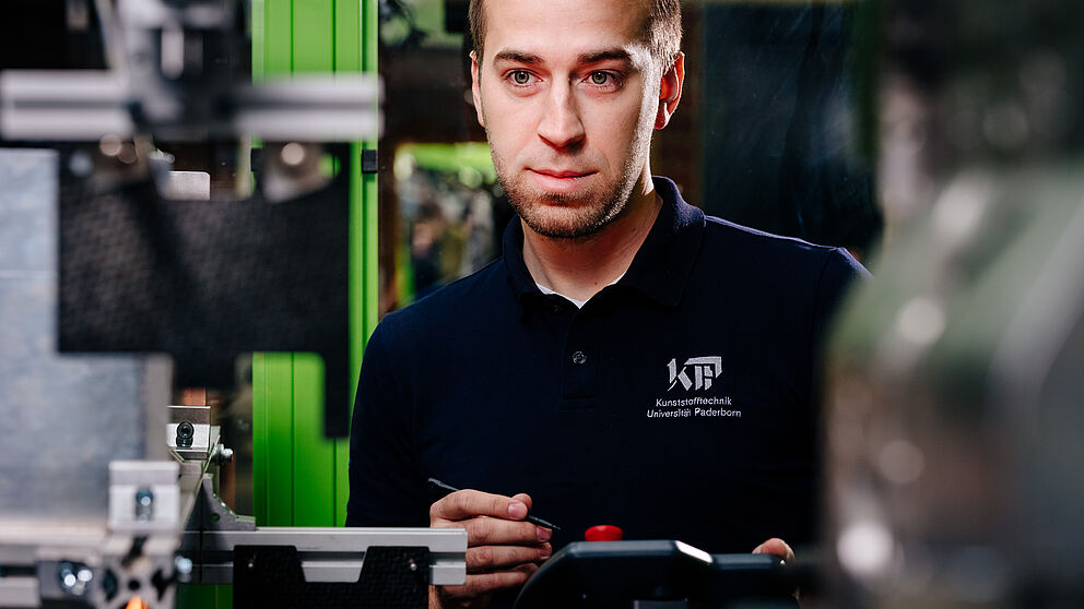 Foto (Universität Paderborn, Besim Mazhiqi): Prof. Dr. Tim Bartley, Leiter der Arbeitsgruppe „Mesoskopische Quantenoptik", demonstriert die Arbeit mit dem Kryostat.