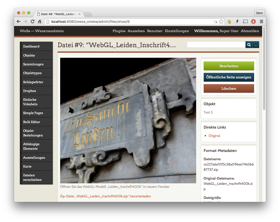Zur Umsetzung dieses Ansatzes fiel die Wahl auf die im kulturwissenschaftlichen Umfeld bewährte Open Source Software-Plattform Omeka. Dessen spezifische Eigenschaften unterscheiden sich deutlich von denen eines gewöhnlichen, webbasierten Content Management Systems: Neben der Möglichkeit zur Präsentation der eingepflegten Inhalte in einem öffentlichen Web-Frontend gestattet Omeka vor allem die strukturierte Speicherung von verschiedensten, immanent generischen Objekttypen und deren Verknüpfung untereinander, mitsamt Werkzeugen zur tiefergehenden semantischen Analyse des Datenbestandes sowie der anschließenden Online-Präsentation der Ergebnisse.