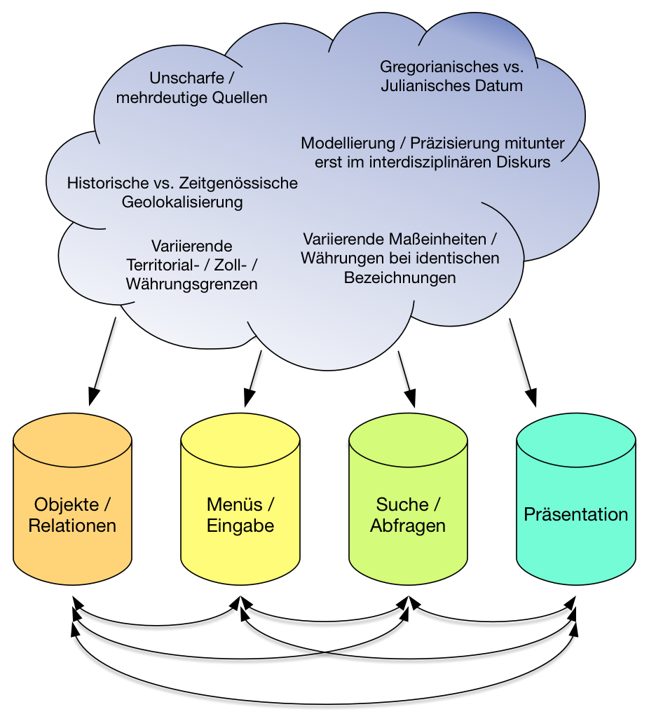 Auf der Basis mitunter unscharfer oder sogar widersprüchlicher Quellen und gleichermaßen offener Bezüge wurde im interdisziplinären Dialog zwischen Kulturwissenschaft und Kontextueller Informatik ein Datenmodell entwickelt, in dem für den Forschungsprozess bedeutsame Objekte (wie etwa Gebäude, Personen, Transportmittel, Quellen etc.) definiert sind, die mit digitalisierten Quellenfunden angereichert werden können. Dieser mehrstufige Prozess offenbarte ein grundlegendes Problem: Während die grundsätzliche Objekthierarchie gut überschaubar ist, entfaltete sich der Bedarf für eine feinere Objektgranularität mit vertiefender Semantik oft erst bei der Testeingabe von Beispieldaten. Häufig handelt es sich dabei um immanent unscharfe kulturwissenschaftlich-forschungstheoretische Aspekte (wie beispielsweise die vergleichende Betrachtung von ungenau definierten Kalenderdaten und Zeitspannen, wahlweise im Gregorianischen oder im Julianischen Kalender), deren Bedeutsamkeit zwar implizit bekannt ist, die sich aber bei expliziter Betrachtung im üblicherweise exakt spezifizierten informatischen Kanon schwer modellieren lässt.