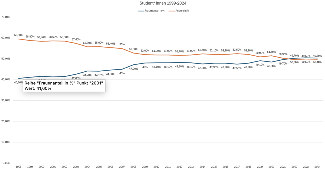 Der Frauenanteil an den Student*innen der Universität Paderborn ist in den letzten Jahren immer weiter gestiegen. Der Studentinnenanteil lag 1998 bei 40,6% und stieg bis zum WS 2023/24 auf 50,4%.