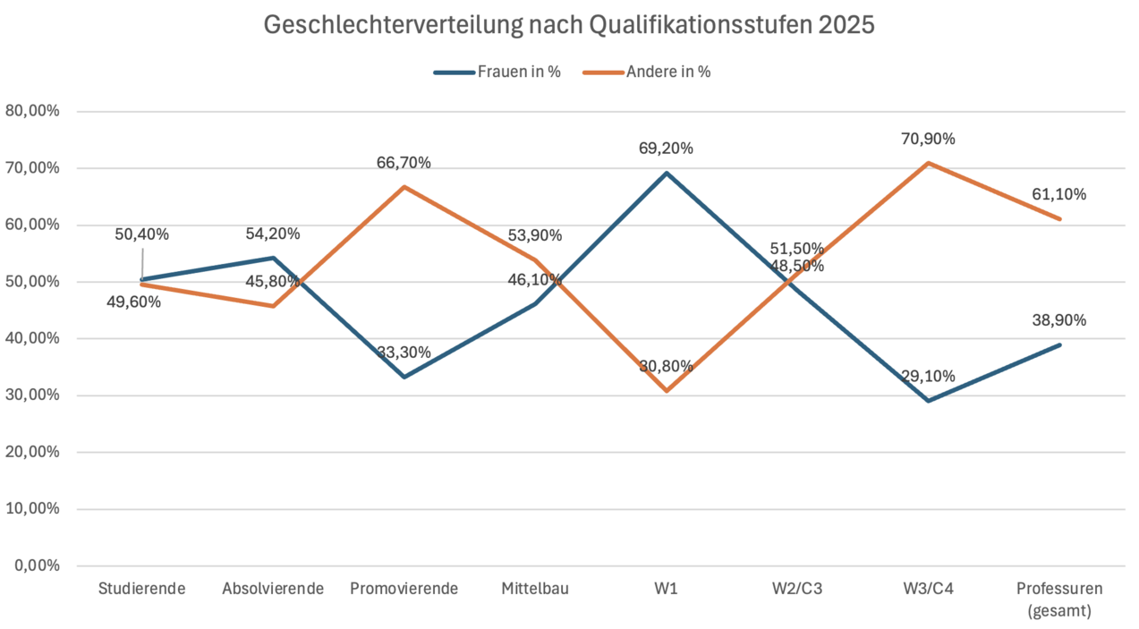 Das Diagramm zeigt die Qualifikationsstufen der wissenschaftlichen Hochschulkarriere und die jeweilige Geschlechterverteilung in diesen Stufen an der Universität Paderborn im Jahr 2025, angefangen vom Student*innenstatus bis hin zur Professur.