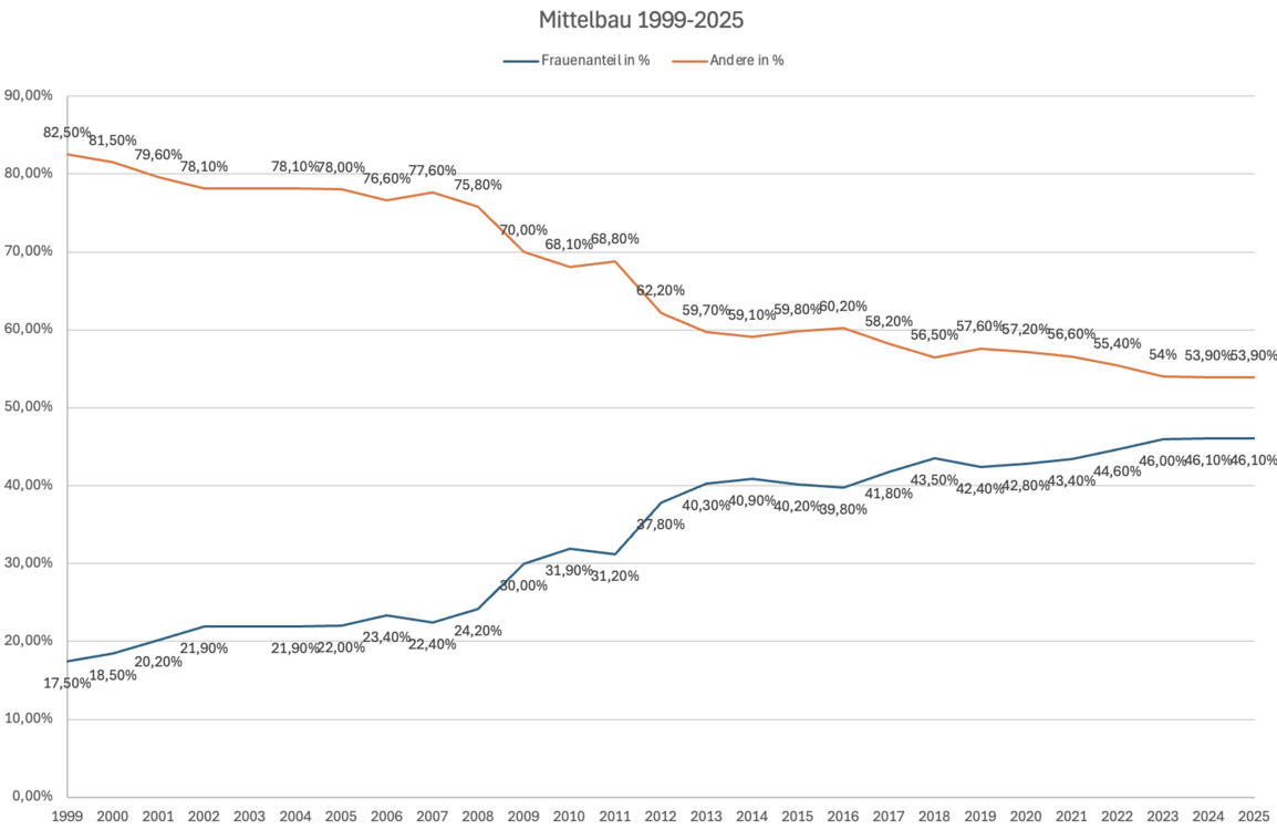 Im Bereich des Mittelbaus der Universität Paderborn waren Frauen zu Beginn der Aufzeichungen stark unterrepräsentiert. Der Anteil von 17,5% aus dem Jahr 1999 stieg bis 2025 um mehr als das Doppelte auf 46,1% an.