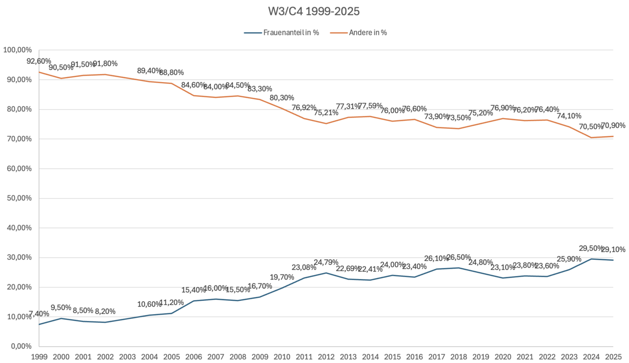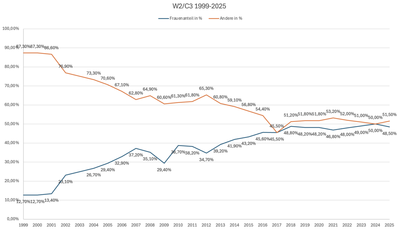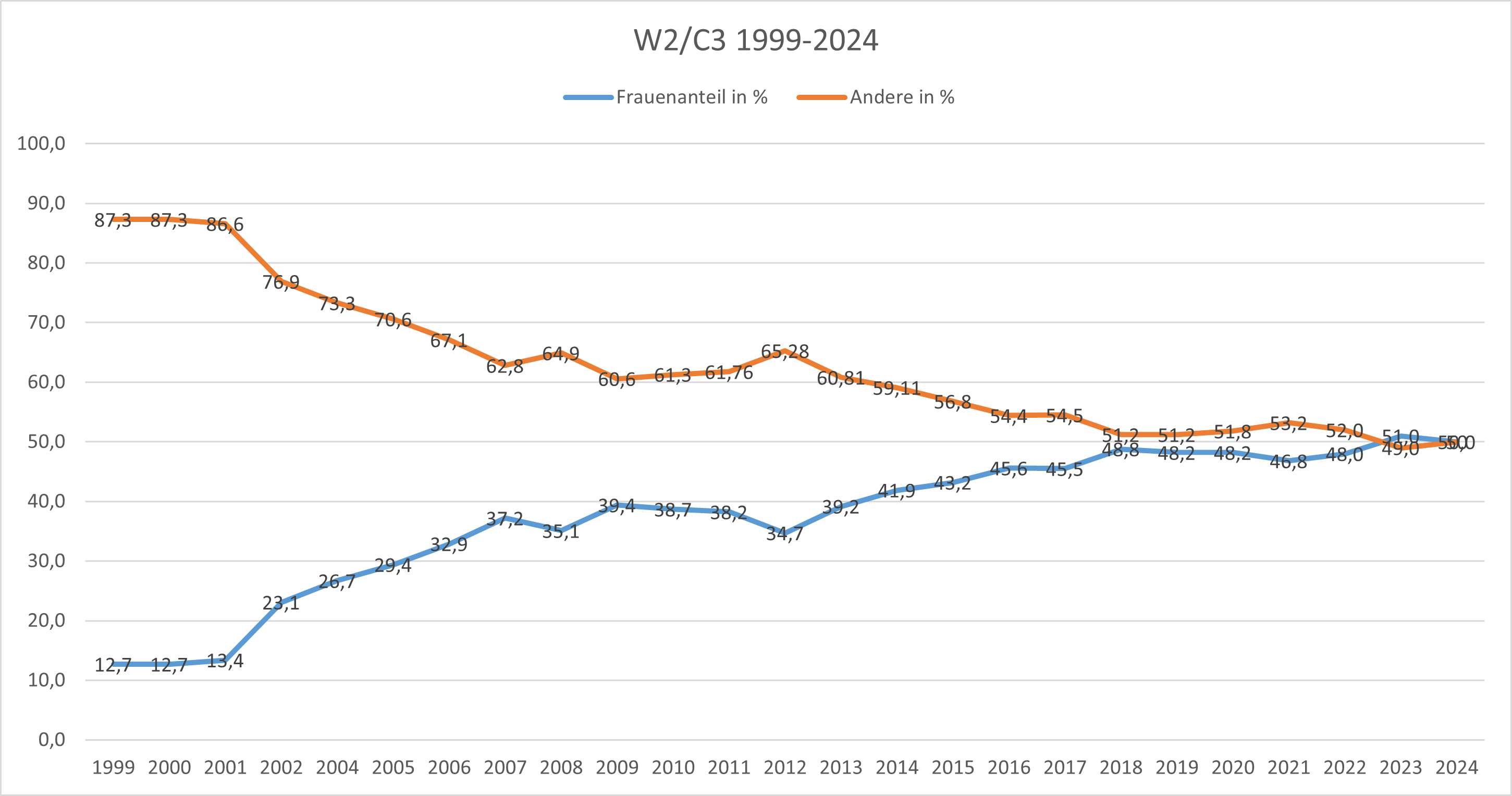 Der Frauenanteil an den W2/C3-Professuren ist seit 1999 stark gestiegen. 1999 waren nur 12,7% der W2/C3-Professuren mit Frauen besetzt. 2022 betrug der Frauenanteil an den W2/C3-Professuren 48,0%. 2023 betrugt der Frauenanteil zum ersten Mal mehr als 50%.