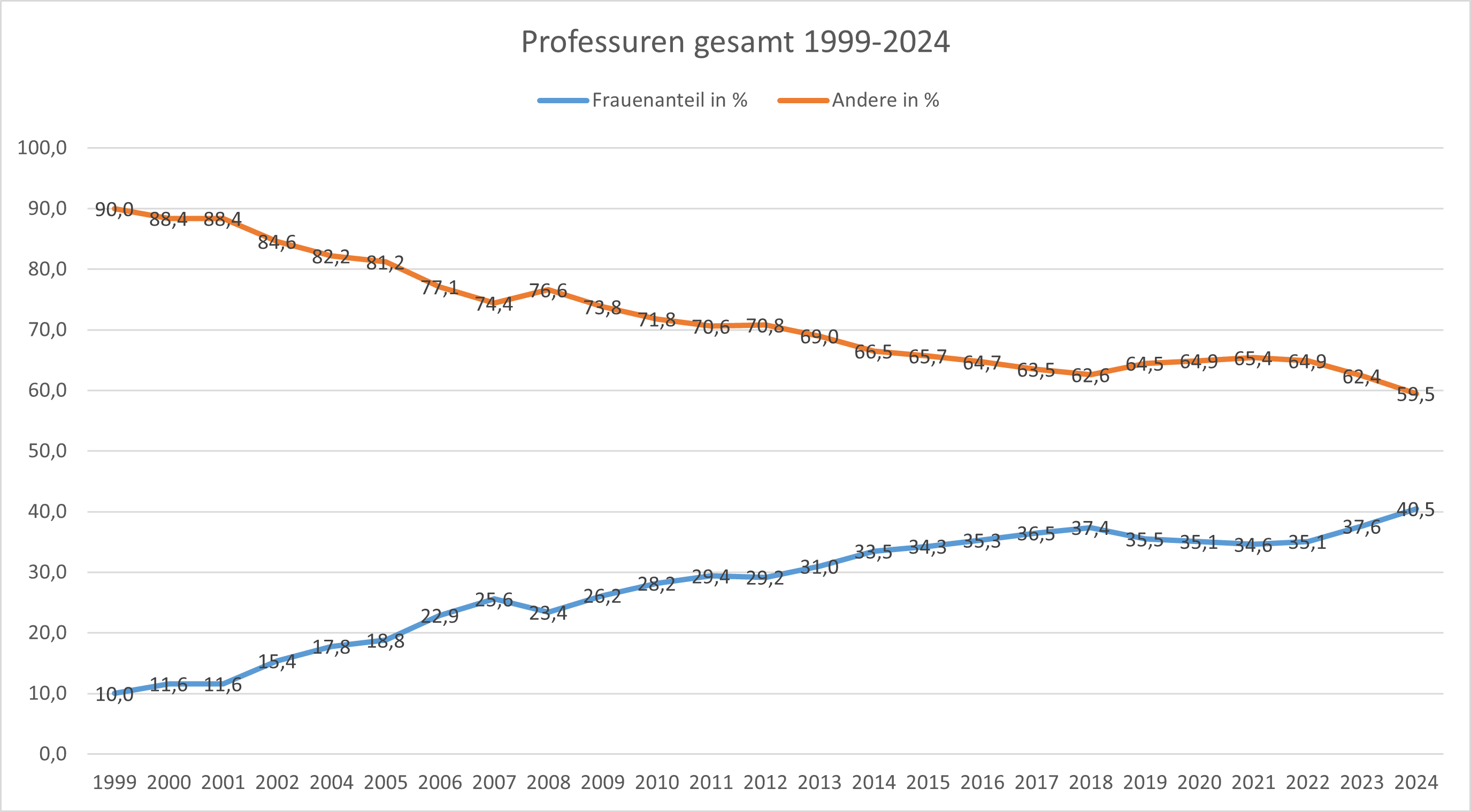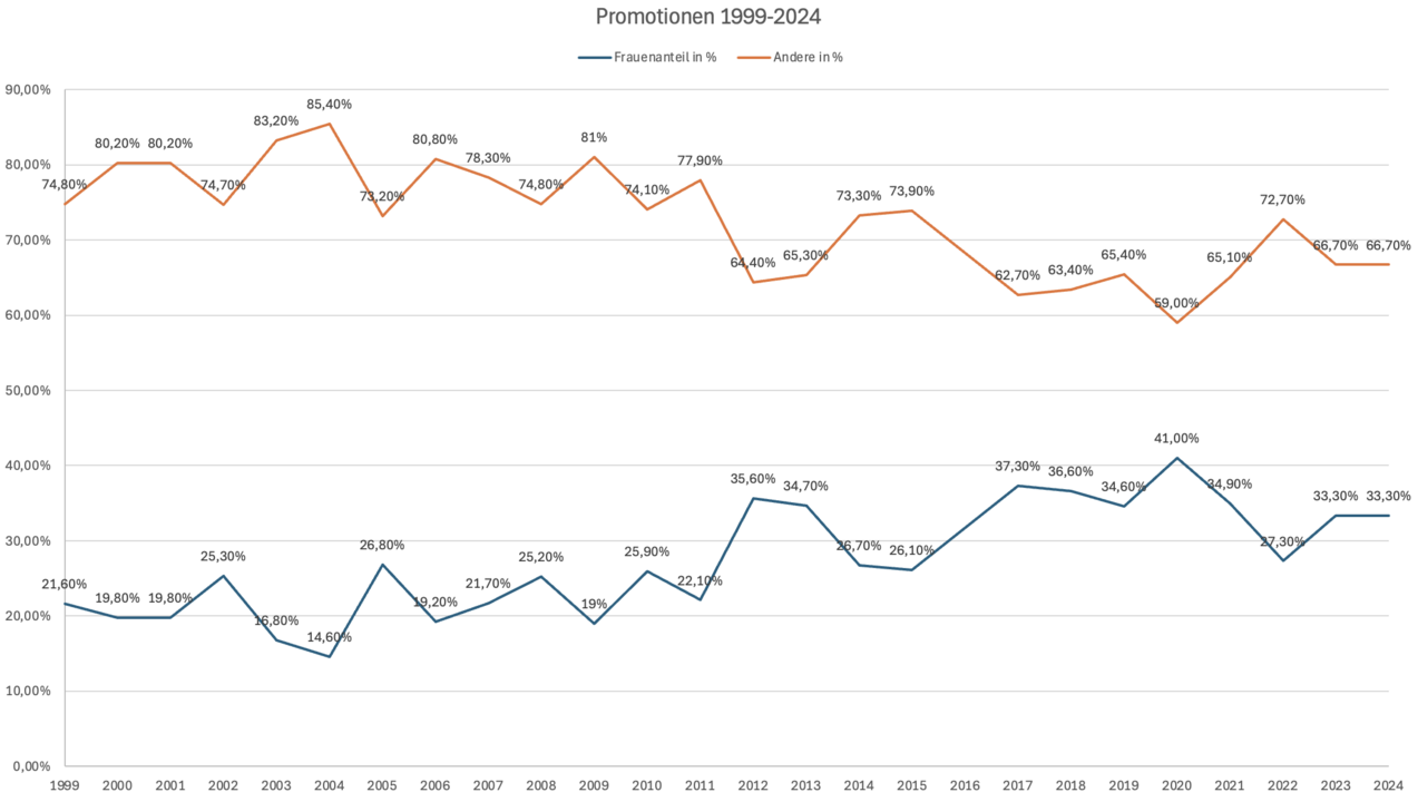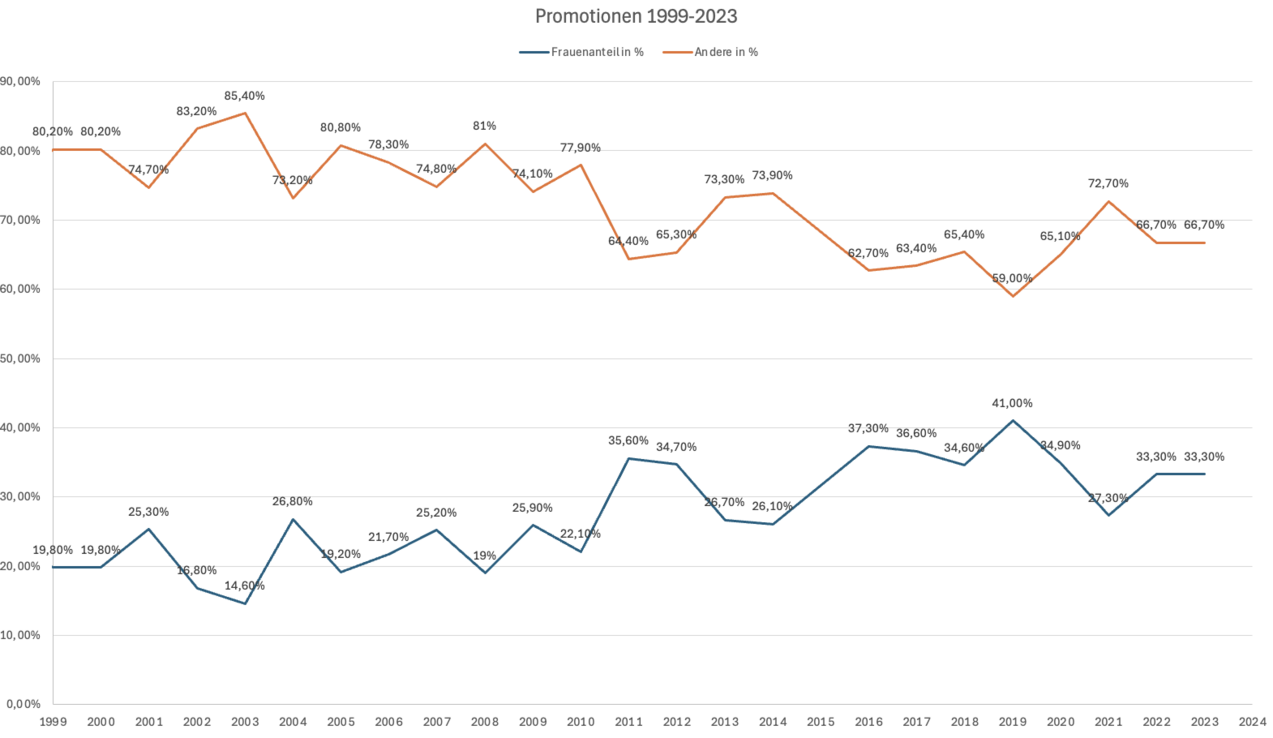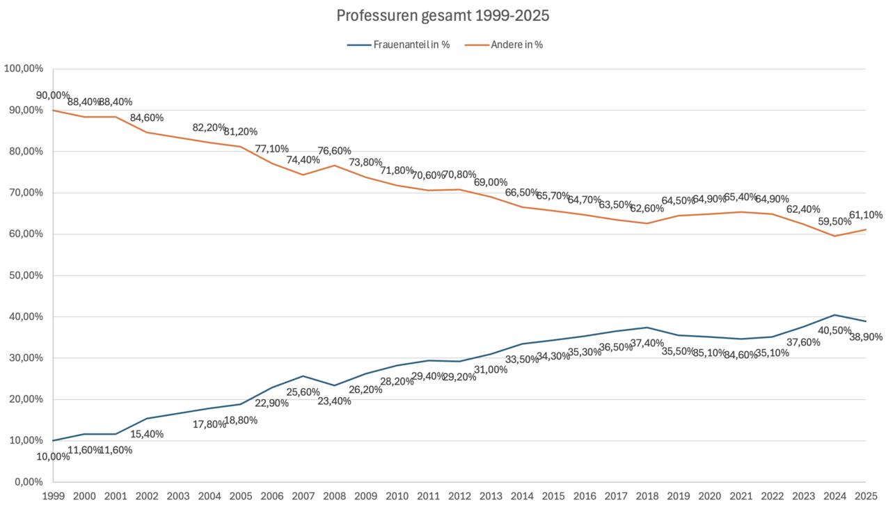 Der Frauenanteil an den W2/C3-Professuren ist seit 1999 stark gestiegen. 1999 waren nur 12,7% der W2/C3-Professuren mit Frauen besetzt. 2022 betrug der Frauenanteil an den W2/C3-Professuren 48,0%. 2023 betrugt der Frauenanteil zum ersten Mal mehr als 50%.