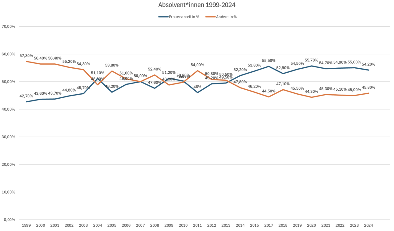 Das Diagramm zeigt die Entwicklung des Frauenanteils an den Absolvent*innen seit 1999. Die abgebildeten Zahlen beziehen sich jeweils auf das Prüfungsjahr, beispielsweise umfasst das Prüfungsjahr 2023 das WS 2022/23 und das SS 2023. Mit dem Anstieg des Frauenanteils unter den Student*innen stieg bis 2003 ebenfalls der Anteil der Absolventinnen an. 2004 schlossen erstmals mit einem Anteil von 51,1% mehr Frauen als Andere ein Studium an der Universität Paderborn ab. Seitdem lag der Anteil der Absolventinnen über 50 %. Im Prüfungsjahr 2024 lag der Anteil der Absolventinnen bei 54,2%.