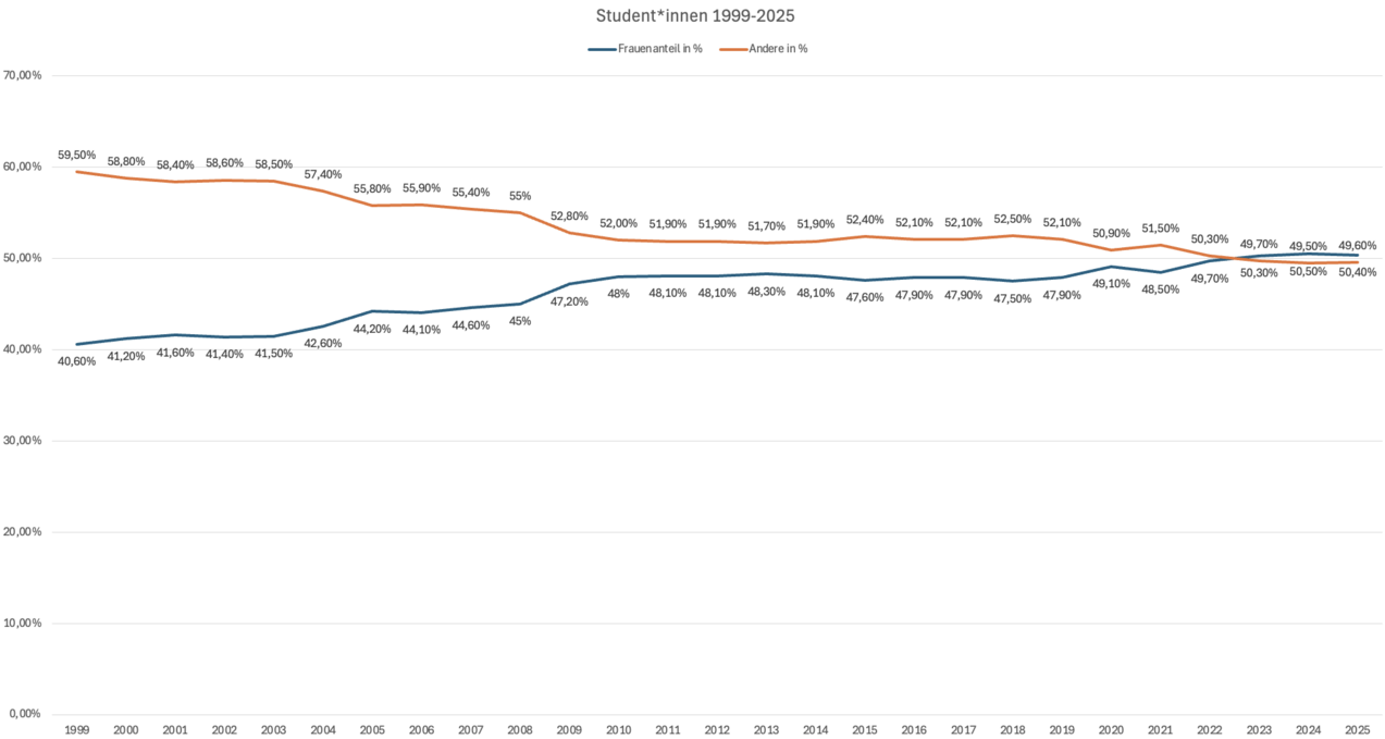 Der Frauenanteil an den Student*innen der Universität Paderborn ist in den letzten Jahren immer weiter gestiegen. Der Studentinnenanteil lag 1999 bei 40,6% und stieg bis zum WS 2024/25 auf 50,4%.