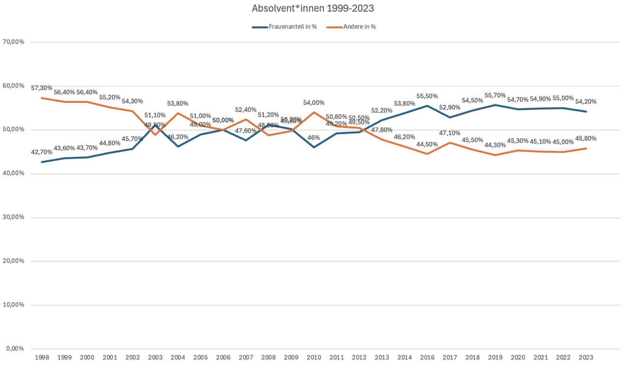 Das Diagramm zeigt die Entwicklung des Frauenanteils an den Absolvent*innen seit 1998. Die abgebildeten Zahlen beziehen sich jeweils auf das Prüfungsjahr, beispielsweise umfasst das Prüfungsjahr 2023 das WS 2022/23 und das SS 2023. Mit dem Anstieg des Frauenanteils unter den Student*innen stieg bis 2002 ebenfalls der Anteil der Absolventinnen an. 2003 schlossen erstmals mit einem Anteil von 51,1% mehr Frauen als Andere ein Studium an der Universität Paderborn ab. Seitdem lag der Anteil der Absolventinnen über 50 %. Im Prüfungsjahr 2023 lag der Anteil der Absolventinnen bei 54,2%.