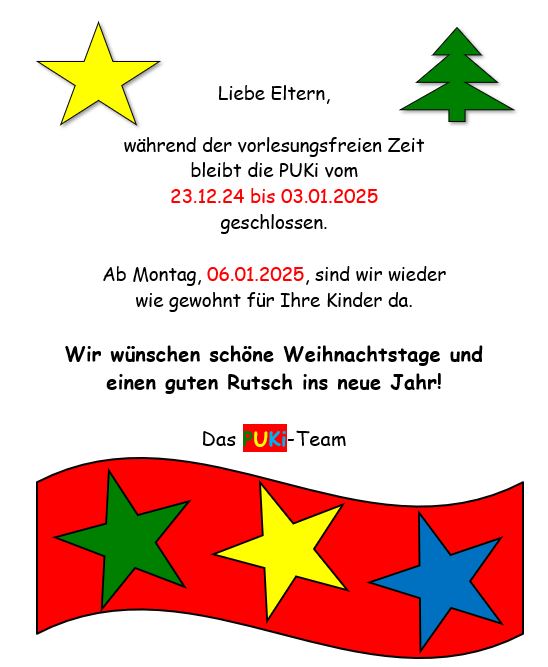 PUKi vom 23.12.-03.01. geschlossen 16.12.2024 Beitrag teilen auf: Teilen auf Instagram Teilen auf Twitter Teilen auf Facebook Teilen auf Xing Teilen auf LinkedIn Teilen über E-Mail Link kopieren Teilen via Web API Download (51 KB)