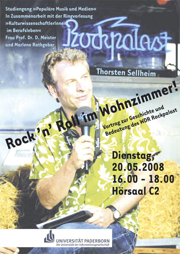 Am Dienstag, 20. Mai 2008, kommt Thorsten Sellheim auf Einladung des Studiengangs „Populäre Musik und Medien“ und in Verbindung mit der Ringvorlesung „KulturwissenschaftlerInnen im Berufsleben“ von Prof. Dr. Dorothee Meister und Marlene Rathgeber zu einem „musikalischen Vortrag“ nach Paderborn. Michael Ahlers vom Fach Musik: „Ein wird ein musikalischer Vortrag von Sellheim anlässlich des 30-jährigen Bestehens der kultigsten aller Musiksendungen.“