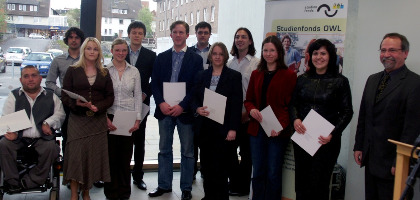 Der im Jahre 2006 gegründete Studienfonds OWL fördert mittlerweile fast 160 Studierende, die an einer der fünf beteiligten Hochschulen in der Region studieren, nämlich an den Universitäten Bielefeld und Paderborn, den Fachhochschulen Bielefeld sowie Lippe und Höxter und der Musikhochschule in Detmold.An der Stipendienübergabe nahmen neben den Hochschuloffiziellen und den Stipendiaten auch Vertreter der Unternehmen und Institutionen aus der Region teil, denen die Stipendiaten dieser Förderrunde ihre Stipendien zu verdanken haben: BOGE Kompressoren (Bielefeld), bsb Bentlage (Bielefeld), Carina Stiftung (Herford), Diamant Software (Bielefeld), Dr. Oetker (Bielefeld), Lippische Landes-Brandversicherungsanstalt (Detmold), Phoenix Contact (Blomberg), Rotary Club Bad Driburg, Sparkasse Höxter, Sparkasse Lemgo, TNS Infratest (Bielefeld/München), Weidmüller (Detmold), Wincor Nixdorf (Paderborn). Und nicht zu vergessen eine ganze Reihe privater Spender.Die Stipendienvergabe in der Fachhochschule in Detmold wurde von den neu aufgenommenen Stipendiaten der Hochschule für Musik musikalisch gestaltet.Der Studienfonds OWL hat in der kurzen Zeit seines Bestehens schon 900.000 Euro an Geldern und Geldzusagen eingeworben. Parallel zur materiellen Förderung soll ein Netzwerk zwischen Förderern und Stipendiaten aufgebaut werden, „das allen Seiten langfristige persönliche und berufliche Vorteile bringen soll“, so die Geschäftsführerin des Studienfonds OWL, Katja Urhahne. Im Vorstand des Studienfonds OWL sind Prof. Dr. Nikolaus Risch (Vorsitzender, Präsident Universität Paderborn), Prof. Tilmann Fischer (stellv. Vorsitzender, Präsident Hochschule OWL), Prof. Dr. Dieter Timmermann (Rektor Universität Bielefeld), Prof. Dr. Beate Rennen-Allhoff (Rektorin Fachhochschule Bielefeld).