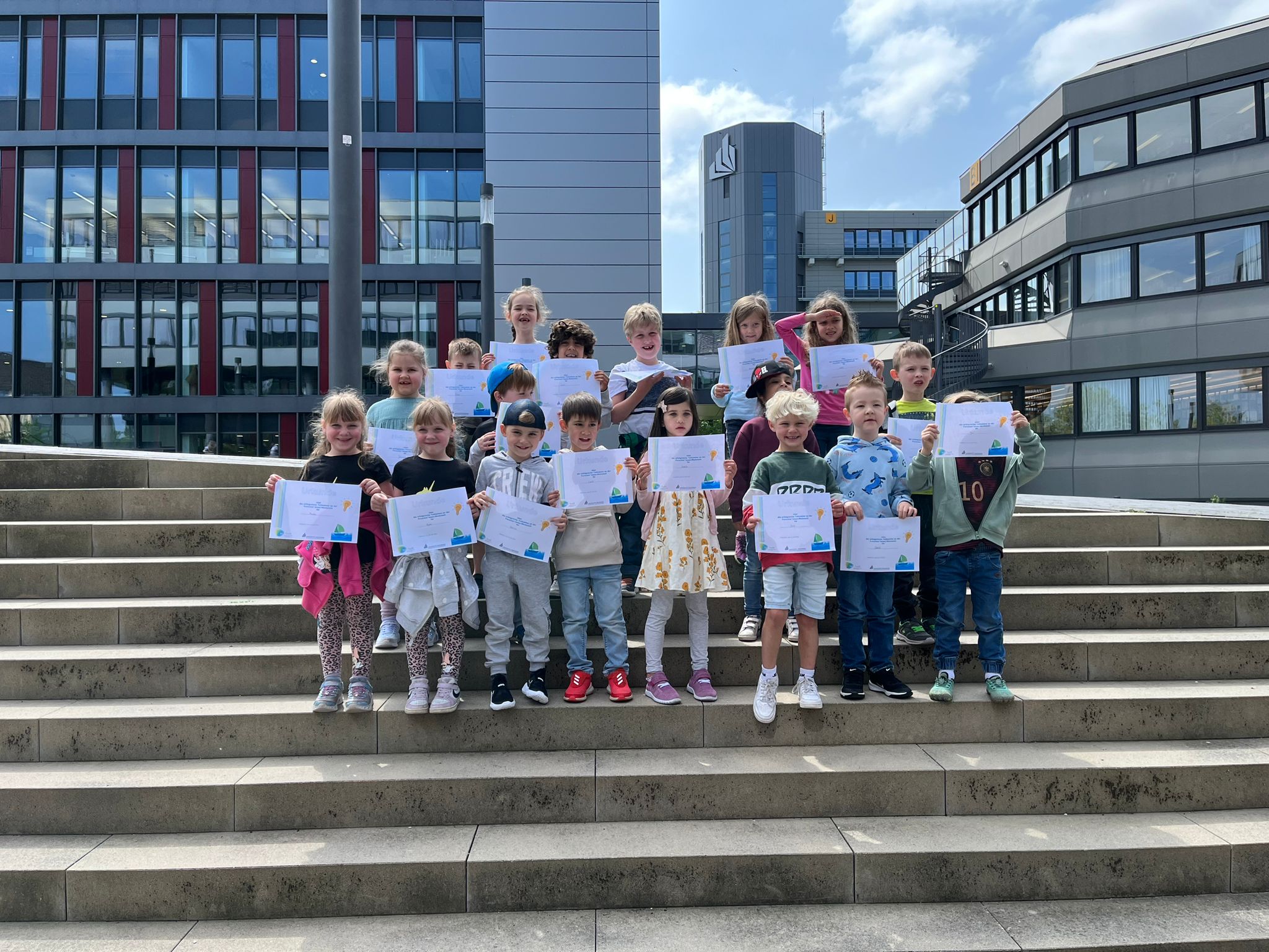 Nach intensivem Nachdenken und Ausprobieren durfte auch die Erkundung der Universität nicht fehlen. Die Kinder folgten den studentischen Mitarbeiterinnen durch die Gänge des Uni-Campus in die große Bibliothek. Überwältigt bestaunten sie auch einen großen Hörsaal, bevor es zur mittäglichen Stärkung in die Mensa ging. Sowohl die Kinder und Erzieherinnen als auch die Ausrichtenden des Lernzentrums „Sachunterrichtstreff“ blicken sehr zufrieden auf die Veranstaltung zurück und freuen sich auf viele weitere KiTa-Tage in der Uni. „Es ist uns ein wichtiges Anliegen – besonders nach den Entbehrungen durch die Coronapandemie – unsere Kita-Kooperationen wieder aufleben zu lassen und damit frühzeitig Kinder spielerisch an eine wissenschaftliche Auseinandersetzung mit MINT-Themen heranzuführen und sie dafür langfristig zu begeistern“, hebt Blumberg abschließend hervor.