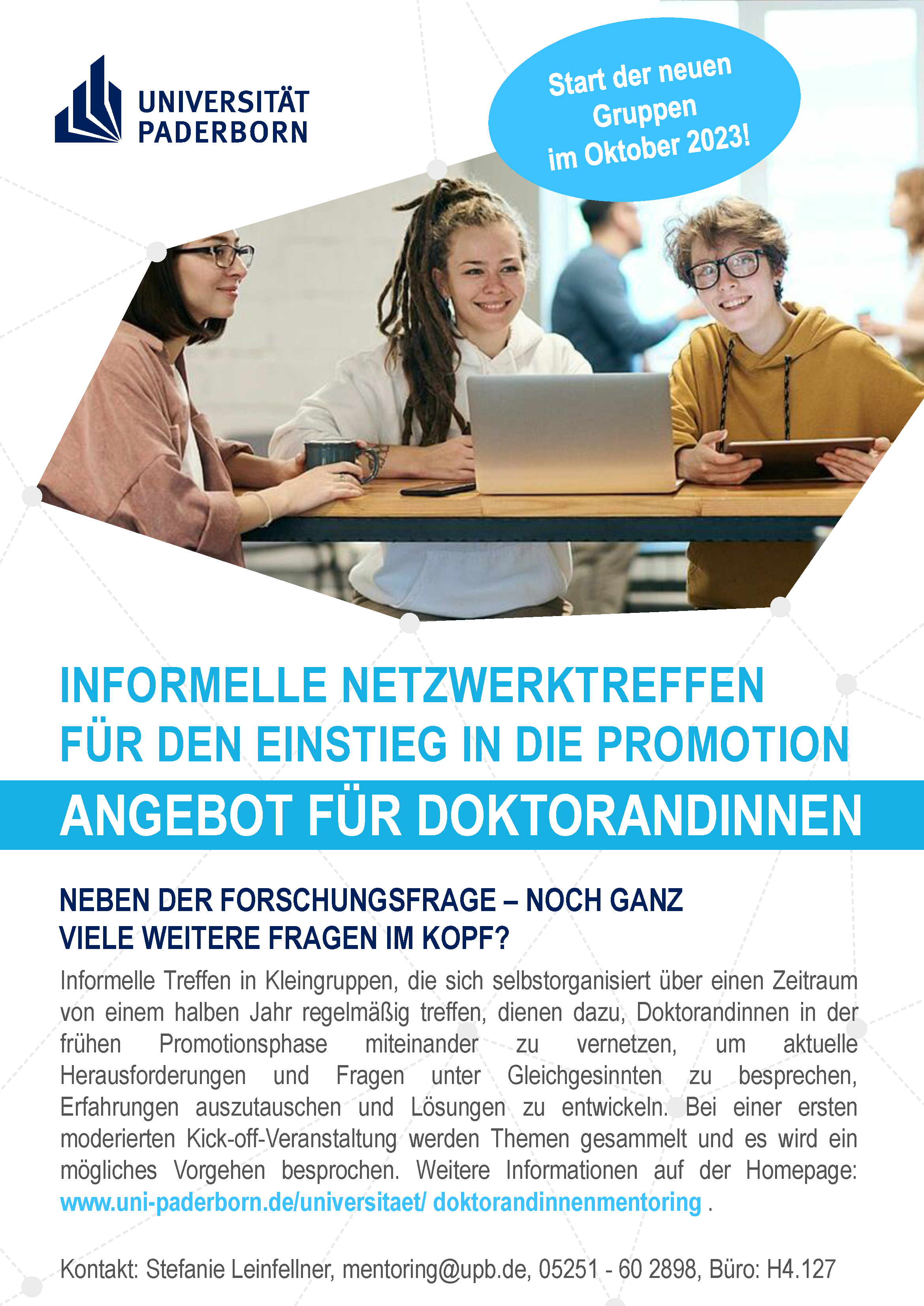 Wie gestalten andere den Einstieg in die Promotion und wie gehen sie mit ersten Herausforderungen wie Tagungen, dem Schreiben des Exposés oder dem Rollenwechsel um? Neben der Forschungsfrage haben Doktorandinnen im ersten Jahr der Promotion oft viele Fragen im Kopf. Im Mentoring-Programm für Doktorandinnen der Universität Paderborn haben Nachwuchswissenschaftlerinnen die Möglichkeit, an informellen Netzwerktreffen teilzunehmen. Ziel ist es, sich in der frühen Promotionsphase miteinander zu vernetzen, aktuelle Herausforderungen und Fragen zu besprechen, Erfahrungen auszutauschen und Lösungen zu entwickeln. Das Programm startet im Oktober. Interessierte können sich bis zum 1. September bei Stefanie Leinfellner unter mentoring(at)upb(dot)de anmelden.