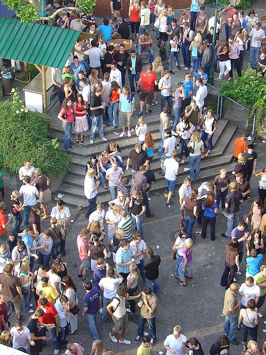 Dies tat der Stimmung bei den etwa 15.000 Feierbegeisterten allerdings überhaupt keinen Abbruch. Der Spaß stand im Vordergrund, lange Wanderzeiten, um von der Hauptbühne zum Beispiel zur Bühne am P-Gebäude zu kommen, waren kein Problem und gehörten halt dazu. Meistens fand sich auf diesen Volksmärschen sowieso immer noch jemand Bekanntes zum Reden beziehungsweise Zuprosten.