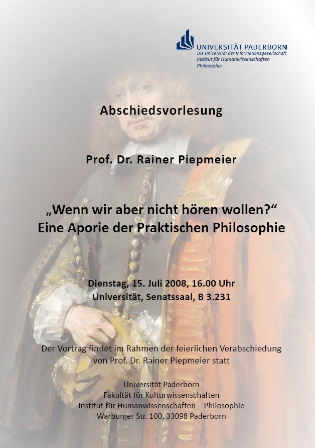 Mit einer Abschiedsvorlesung wird am Dienstag der Philosophieprofessor Rainer Piepmeier in die Pensionierung gehen. Herr Piepmeier lehrt seit 1975 an der Hochschule Paderborn, wo er seit 1982 Universitätsprofessor ist. Seine Verabschiedung findet im festlichen Rahmen statt. Herr Prof. Piepmeier wird einen Vortrag zum Thema "Wenn wir aber nicht hören wollen? Eine Aporie der Praktischen Vernunft" halten. Außerdem wird Herr Prof. Carneiro von der Hochschule für Musik die II. Suite für Violoncello Solo von Johann Sebastian Bach spielen. Zu der öffentlichen Veranstaltung sind interessierte Gäste herzlich eingeladen. Sie findet am 15.07.2008 um 16.00 Uhr im Senatssitzungssaal, Raum B3.231, statt.