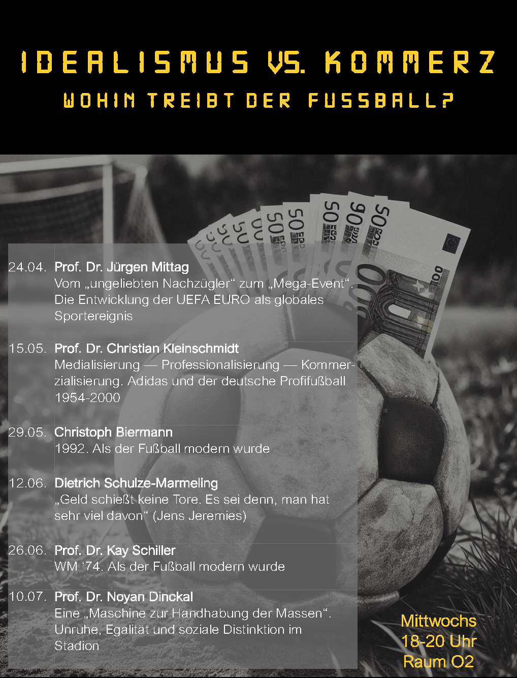 Im Sommersemester veranstaltet der Arbeitsbereich Zeitgeschichte des Historischen Instituts der Universität Paderborn unter dem Titel „Idealismus vs. Kommerz. Wohin treibt der Fußball?“ eine Vortragsreihe zur Geschichte der Kommerzialisierung im Fußball. Alle Interessierten sind eingeladen, die Vorträge, die jeden Mittwoch von 18 bis 20 Uhr in Hörsaal O2 stattfinden, zu besuchen. Am Mittwoch, 12. Juni, hält der Autor Dietrich Schulze-Marmeling den Vortrag „Geld schießt keine Tore. Es sei denn, man hat sehr viel davon“.