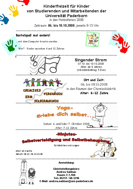 In den Herbstferien findet wieder eine Ferienfreizeit für Kinder von Studierenden und Mitarbeitenden der Universität Paderborn statt. Vom 06.-10. Oktober 2008 gibt es interessante Angebote aus den Bereichen Sport, Chemie, E-Technik und Informatik für Kinder zwischen sechs und zwölf Jahren.