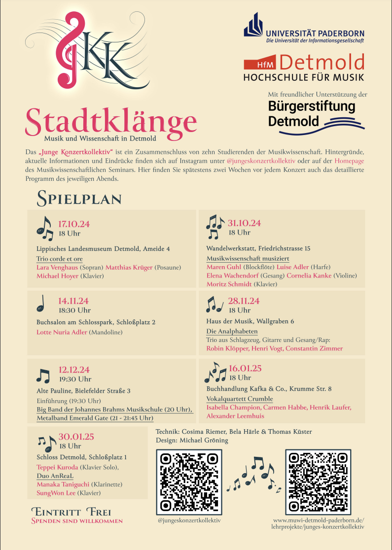 Das „Junge Konzertkollektiv“, ein Zusammenschluss von zehn Studierenden der Musikwissenschaft an der Universität Paderborn, organisiert eine Konzertreihe. Die Leitung übernimmt Luise Adler vom Musikwissenschaftlichen Seminar Detmold/Paderborn. Die Konzerte beginnen am 17. Oktober und finden im zweiwöchigen Turnus jeweils donnerstags an verschiedenen Orten in Detmold statt. Der Eintritt ist frei.