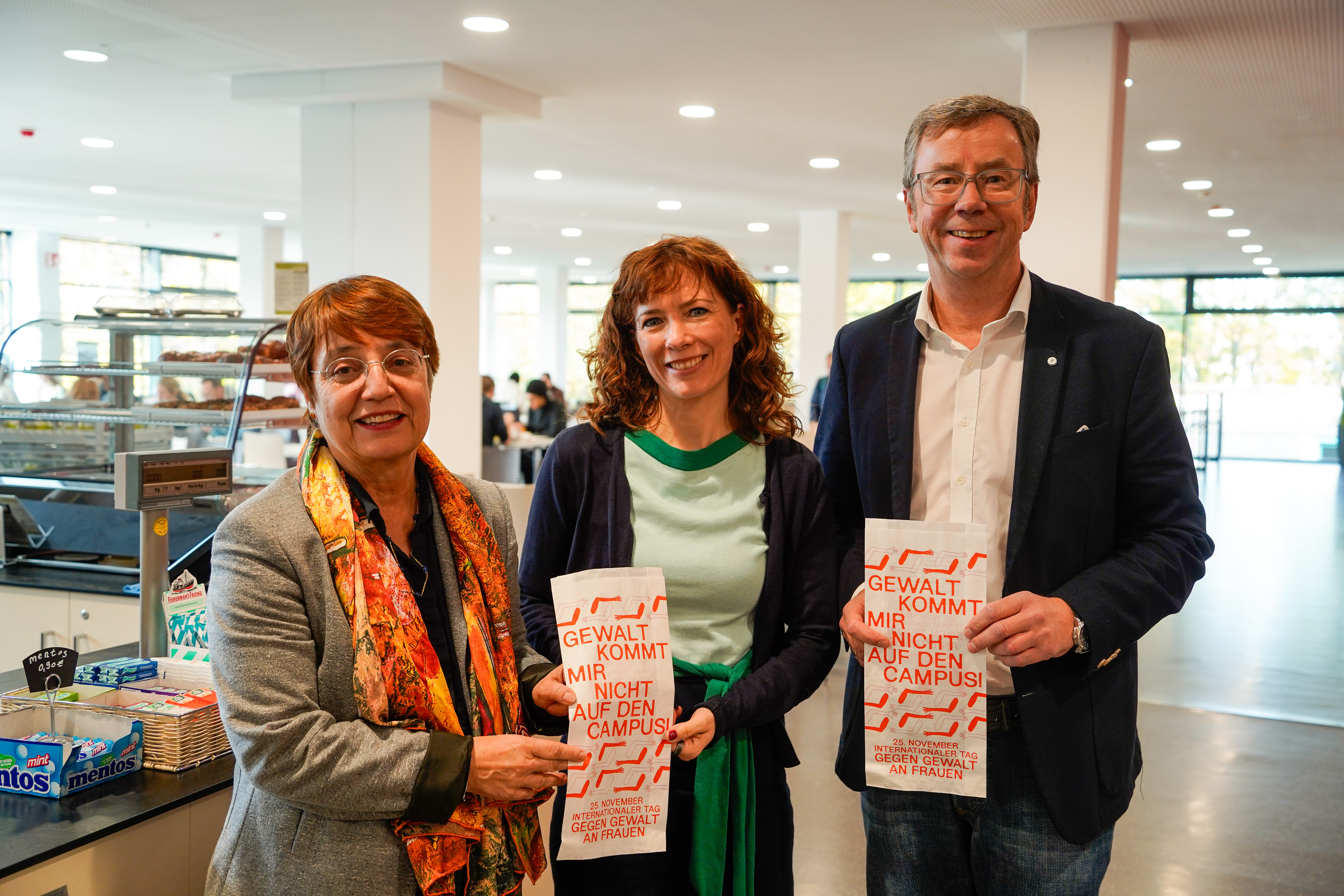 Am Abend wird das H-Gebäude orange angestrahlt. Außerdem liegen in der kommenden Woche in allen gastronomischen Einrichtungen auf dem Campus besondere Brötchentüten aus. Die Tüten sind versehen mit einer Illustration von Viola Dessin, die den sogenannten „Stillen Hilferuf“ zeigt – ein Handzeichen, das es von Gewalt bedrohten Menschen ermöglicht, stumm um Hilfe zu bitten. Die Aktion ist ein gemeinsames Engagement der Landeskonferenz der Gleichstellungsbeauftragten der Hochschulen und Universitätsklinika des Landes Nordrhein-Westfalen (LaKof NRW). Die Brötchentüten mit dem Spruch „Gewalt kommt mir nicht auf den Campus“ knüpfen an die Aktion „Gewalt kommt mir nicht in die Tüte“ an, die bundesweit viele kommunale Gleichstellungsbüros mit kooperierenden Bäckereien durchführen, um auf das Thema Gewalt gegen Frauen aufmerksam zu machen.