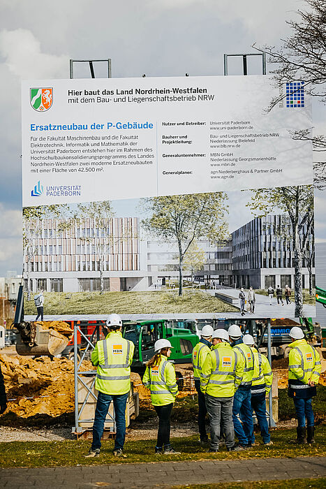 Die Universität Paderborn und der Bau- und Liegenschaftsbetrieb des Landes Nordrhein-Westfalen (BLB NRW) starten ein zukunftsweisendes Bauprojekt: Auf einer derzeit unbebauten Erweiterungsfläche des Campus am Mersinweg entstehen zwei moderne Neubauten mit einer Bruttogrundfläche (BGF) von 42.541 Quadratmetern. Diese sollen die älteren Gebäude P1 sowie P4 bis P7 ersetzen. Mit einem besonderen Augenmerk auf ressourcenschonender Energieversorgung wird der neue Komplex zukünftig Räume für Forschung und Lehre für die Fakultät für Maschinenbau sowie das Institut für Elektro- und Informationstechnik, angesiedelt in der Fakultät für Elektrotechnik, Informatik und Mathematik, bieten. Das Projekt betrifft zwei der fünf Fakultäten der Universität Paderborn und stellt eines der größten Neubauvorhaben seit der Gründung der Universität dar. Zum Baustart trafen sich Simone Probst, Vizepräsidentin für Wirtschafts- und Personalverwaltung der Universität Paderborn, Wolfgang Feldmann, Leiter der Niederlassung Bielefeld des BLB NRW, Dr. Martina Gerdes-Kühn, Dezernentin des Dezernats 5 der Universität Paderborn, Ante Niggemeier, Abteilungsleiter der Abteilung Baumanagement Hochschulen 2 des BLB NRW, sowie Markus Nabrotzki, technischer Projektverantwortlicher des BLB NRW, und gaben den offiziellen Startschuss für das Bauprojekt.