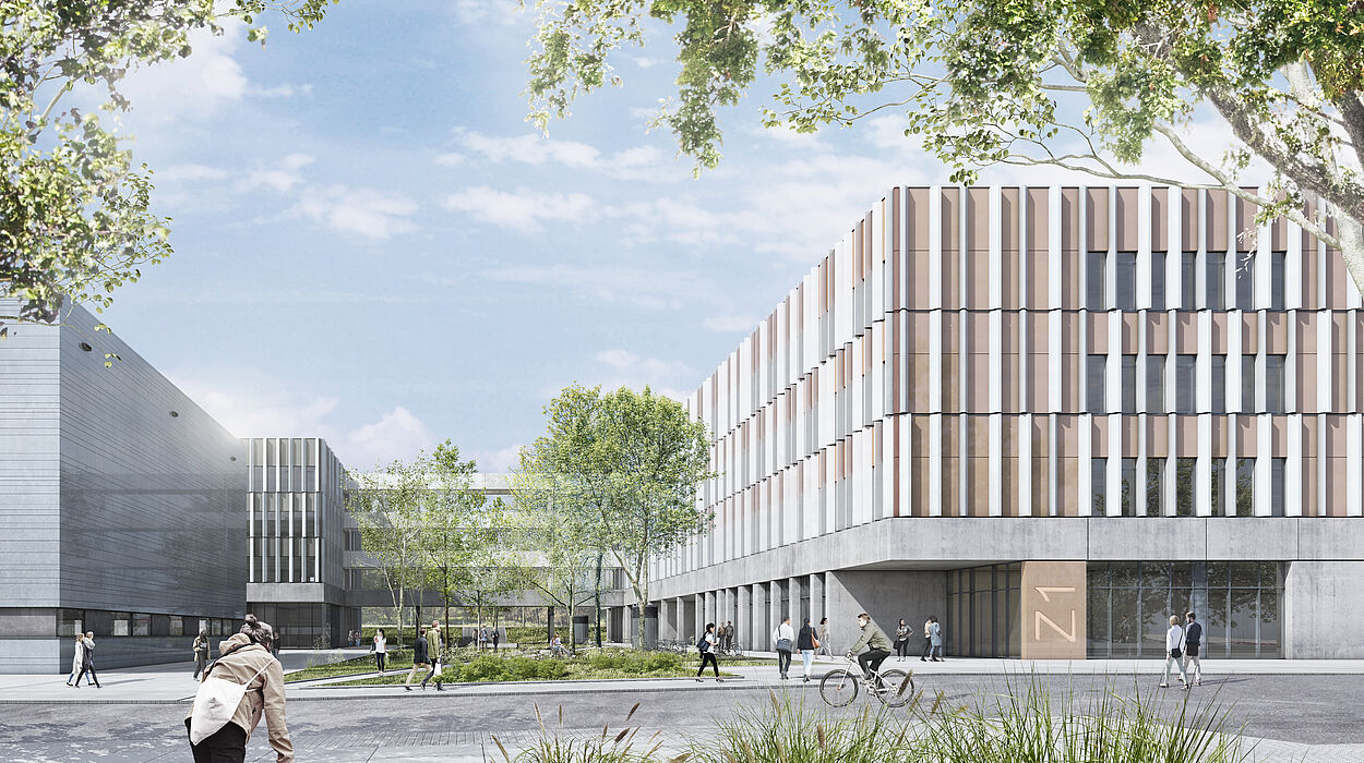 Ein Schlüsselaspekt des Neubauprojekts ist die zukunftsfähige Energieversorgung. Die neuen Gebäude werden über eine unterirdische Medientrasse mit dem Hochleistungsrechenzentrum der Universität verbunden, um dessen Abwärme effizient zu nutzen. Diese Maßnahme reduziert den Primärenergiebedarf erheblich und unterstützt das Ziel einer umweltfreundlichen Campusentwicklung. Darüber hinaus werden die Voraussetzungen geschaffen, damit die Neubauten die Silber-Zertifizierung im Bewertungssystem für nachhaltiges Bauen (BNB) erreichen. Die Gebäude werden nach dem energetischen Standard Effizienzgebäude 40 (EG 40) errichtet und mit einer Photovoltaikanlage und begrünten Dächern ausgestattet. „Dieser Neubau vereint moderne Architektur mit nachhaltiger Bauweise“, erklärt Wolfgang Feldmann, Leiter der Niederlassung Bielefeld des BLB NRW. „Wir setzen auf langlebige Materialien und eine energieeffiziente Versorgung, die einen wichtigen Beitrag zum Klimaschutz leistet.“