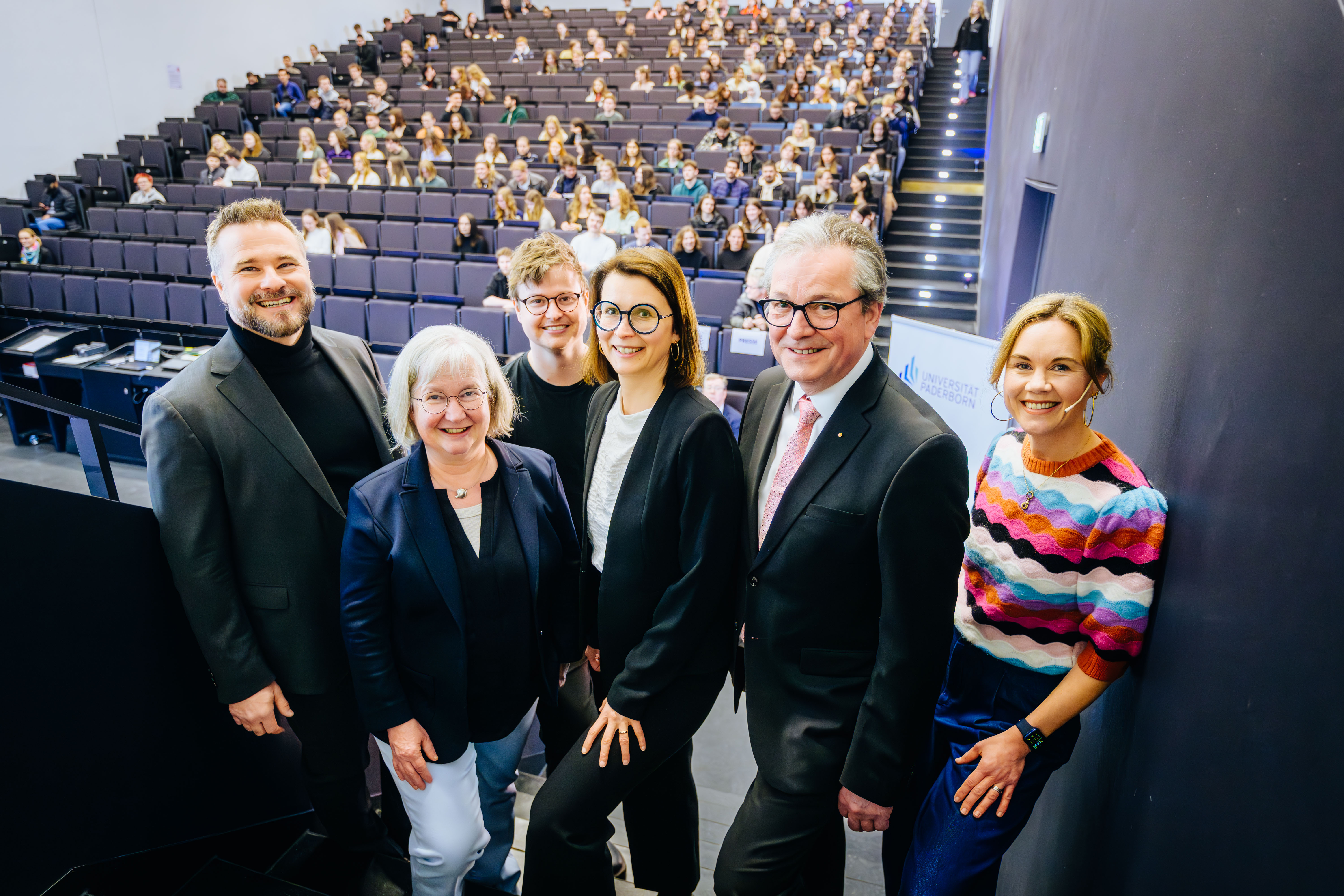 Gemeinsam mit Prof. Dr. Beate Flath, Vizepräsidentin für Lehre, Studium und Qualitätsmanagement, und Michael Dreier, Bürgermeister der Stadt Paderborn, sprach Prof. Bauer über die einzigartigen Möglichkeiten, die die Universität und die Stadt Paderborn bieten – von der vielfältigen Forschung und Lehre, über die Nähe zur Innenstadt und dem idyllischen Paderquellgebiet sowie dem gastronomischen Angebot bis hin zu Möglichkeiten für persönliches Engagement. Prof. Flath betonte: „Seien Sie auch von meiner Seite herzlich willkommen an unserer Universität und in dieser lebendigen Stadt. Wir bieten Ihnen nicht nur ein breitgefächertes Studienangebot, sondern auch viele Gelegenheiten, sich in nachhaltigen Projekten oder kulturellen und sozialen Initiativen einzubringen. Für jede und jeden ist etwas dabei.“