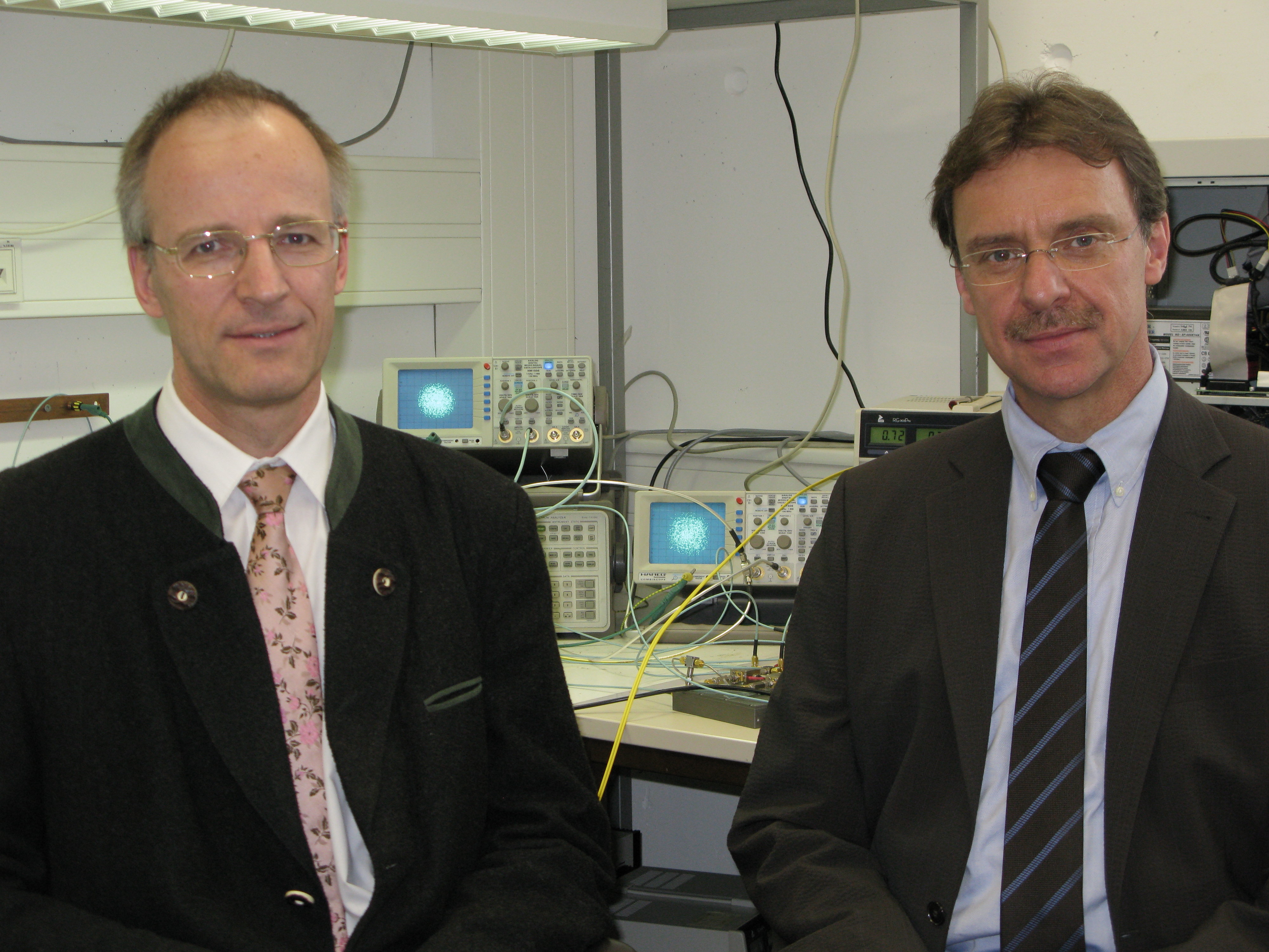 Ihre Erfolge, da sind sich die Paderborner Forscher einig, sind auch das Resultat guter Zusammenarbeit. „Unsere Gruppen ergänzen sich,“ erläutert Ulrich Rückert die Arbeitsteilung. „Reinhold Noé, Dr. Sebastian Hoffmann und Timo Pfau haben erklärt, wie die Signale verarbeitet und wiedergewonnen werden müssen.“ Reinhold Noé ergänzt: „Hinzukommen musste aber die Mikroelektronikerfahrung von Ulrich Rückert. Erst damit wurde die gemeinsame Entwicklung eines hochintegrierten Schaltkreises möglich, der genau das leistet.“ Den haben Ralf Peveling, Christian Wördehoff und Vijitha Herath entworfen. Dazu wiederum passen schnelle Signalwandler, sogenannte Analog-Digital-Wandler, die Dr. Olaf Adamczyk entwickelt hat. In anderen Worten: Noés Gruppe hat den schnellen analogen, Rückerts Gruppe den hochintegrierten digitalen Teil der Elektronik beigesteuert. Inzwischen haben die Paderborner Elektrotechniker den Signalverarbeitungsbaustein und Signalwandler in den Überlagerungsempfänger ihres optischen Datenübertragungssystems eingebaut und erfolgreich getestet.