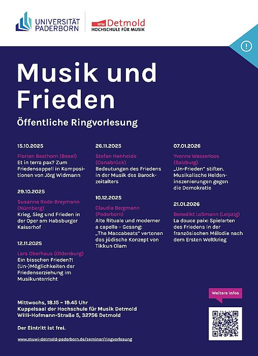 Musik gilt seit der Antike als zentrales Medium der künstlerischen Auseinandersetzung mit dem Thema „Frieden“, dessen unterschiedliche Facetten in der Ringvorlesung „Musik und Frieden“ des Musikwissenschaftlichen Seminars Detmold/Paderborn beleuchtet werden. In diesem Rahmen hält Prof. Dr. Yvonne Wasserloos von der Universität Mozarteum Salzburg am Mittwoch, 6. Januar, einen Vortrag zum Thema „‚Un-Frieden' stiften. Musikalische Heldeninszenierungen gegen die Demokratie“. Die Veranstaltung findet ab 18.15 Uhr im Kuppelsaal der Hochschule für Musik Detmold (Willi-Hofmann-Str. 5) statt. Der Eintritt ist frei.