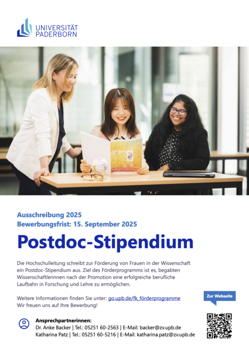 Die Universitätsleitung schreibt zur Förderung von Frauen in der Wissenschaft aktuell wieder Postdoc-Stipendien aus. Interessierte können sich bis zum 15. September bewerben. Ziel des Förderprogramms ist es, begabten Wissenschaftlerinnen nach der Promotion eine erfolgreiche berufliche Laufbahn in Forschung und Lehre zu ermöglichen.