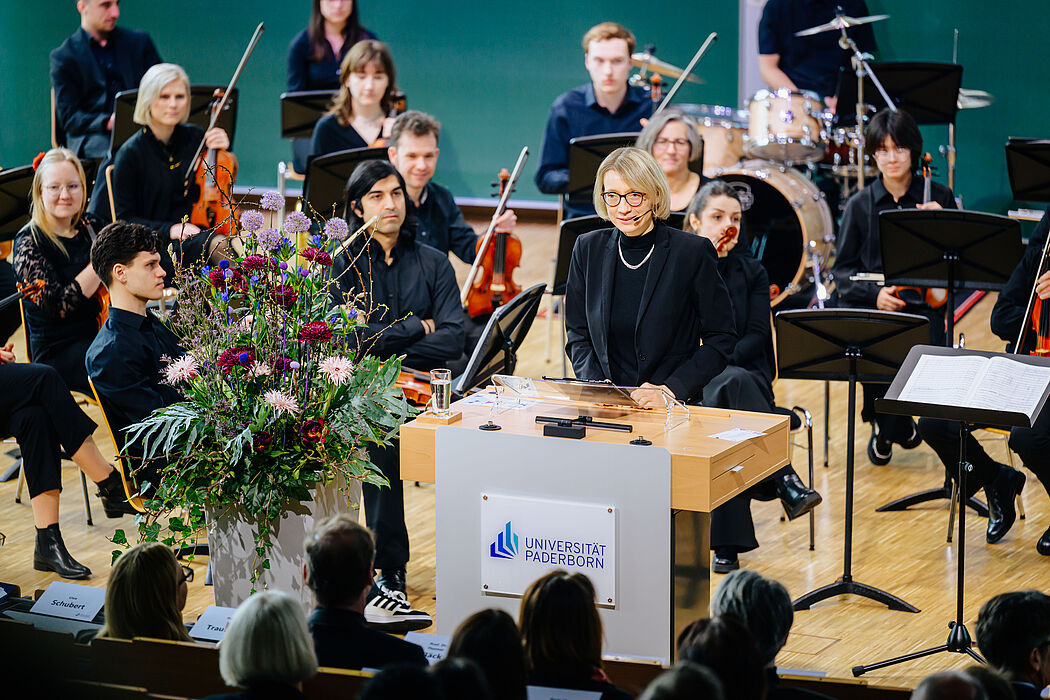Den Festvortrag hielt Prof. Dr. Michaela Vogt, Prorektorin für Internationales, Diversität und Gesellschaft an der Universität Bielefeld, zum Thema „Wissenschaft und Wirkung – Warum eine starke Region starke Universitäten braucht“. Dabei ging sie besonders auf die Relevanz einer guten Kooperation zwischen Universitäten ein. Als Beispiele der Universitäten Paderborn und Bielefeld nannte sie gemeinsame Sonderforschungsbereiche, den Campus OWL und den Studienfonds OWL. Des Weiteren betonte Prof. Vogt, dass Universitäten unverzichtbar für die Demokratie seien. Dementsprechend müsse eine Universität sichtbar machen, dass sie Teil einer Region ist und den Austausch innerhalb dieser fördern.