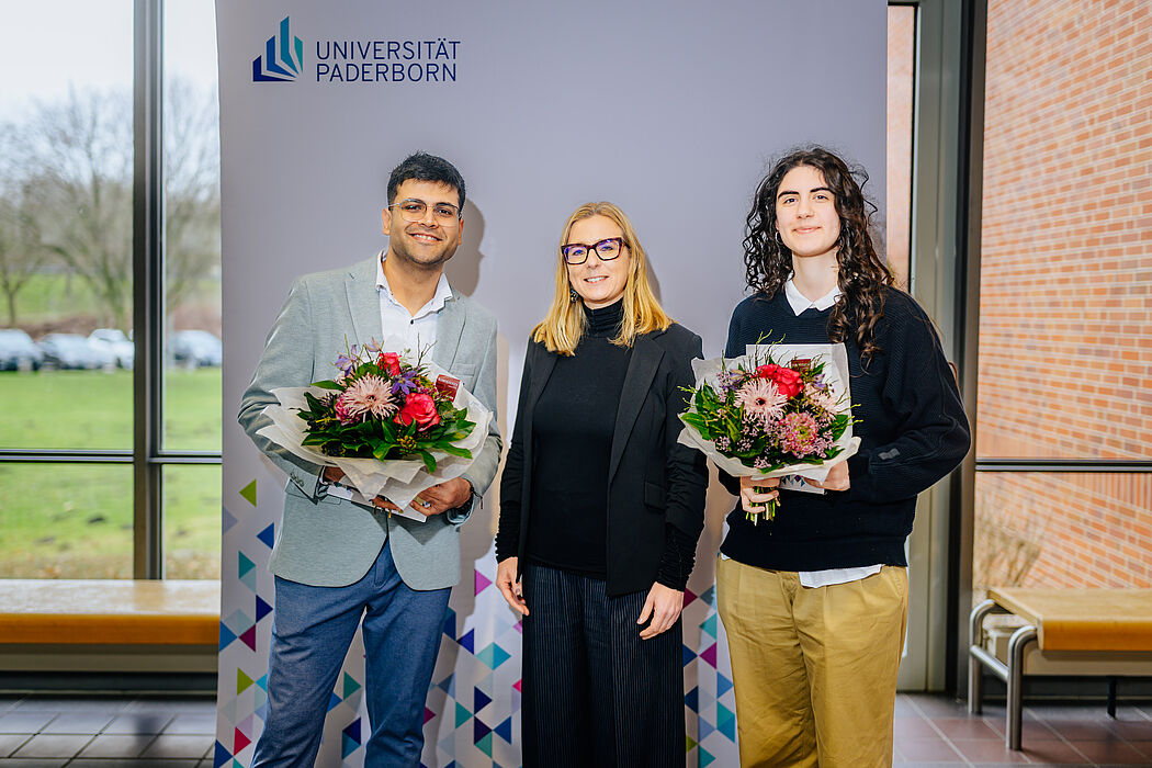 Fünf Absolvent*innen aus allen Fakultäten der Universität Paderborn durften sich über ein Preisgeld von jeweils 1.000 Euro freuen. Die Universitätsgesellschaft honorierte Rose Sunil, Luca Maurice Jotzo, Paul Steinmeier, Niklas Lamberty und Nicole Grieger für ihre ausgezeichneten Masterarbeiten. Hasna Mahmoud erhielt den Preis der Universitätsgesellschaft für internationale Studierende mit besonderen fachlichen Leistungen und großem sozialen Engagement. Der Förderpreis des DAAD für internationale Studierende ging an Lakshay Khanna. Dieser Preis wird jährlich einmal pro Hochschule vergeben.
