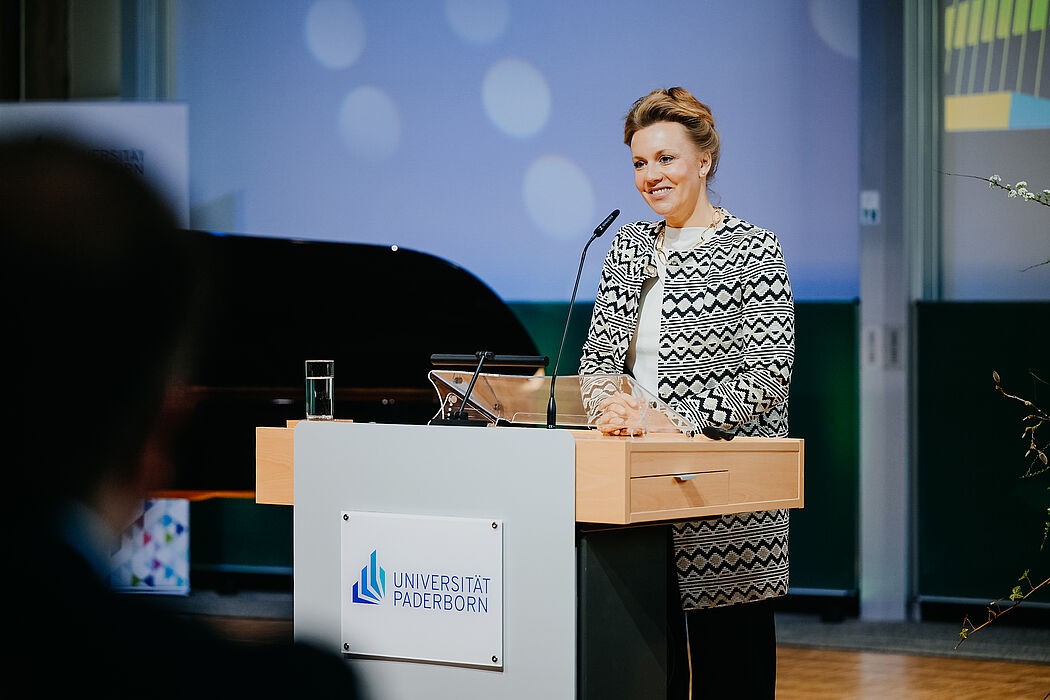 Den Festvortrag zum Thema „Wenn Licht Maßstäbe setzt – Photonik und Quantentechnologien als Schlüsseltechnologien für Wirtschaft und Gesellschaft“ hielt Prof. Dr. Cornelia Denz, Präsidentin der Physikalisch-Technischen Bundesanstalt Braunschweig.
